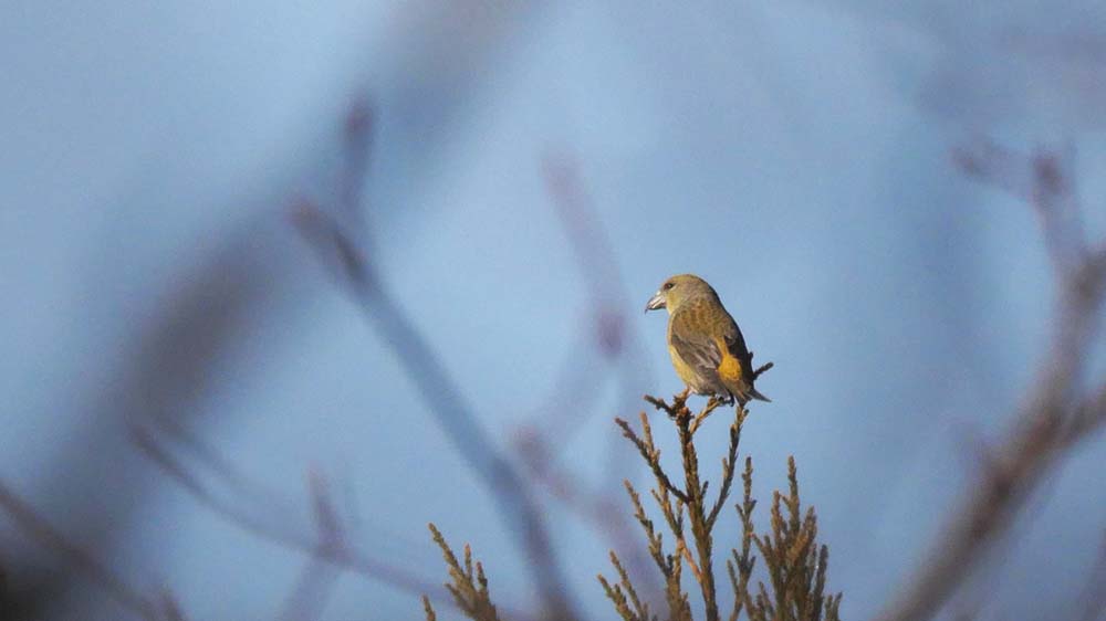 終了後は午後から仲間と二人、2時間程度イスカを探して県森奥で散策。一ヶ所で♂ともう一羽が飛び立ったのを確認、更に奥では鳴き声を確認後外に出て、1羽が飛んで♀が杉の頂上に居るのを確認し、一応初撮影までして頂きました。