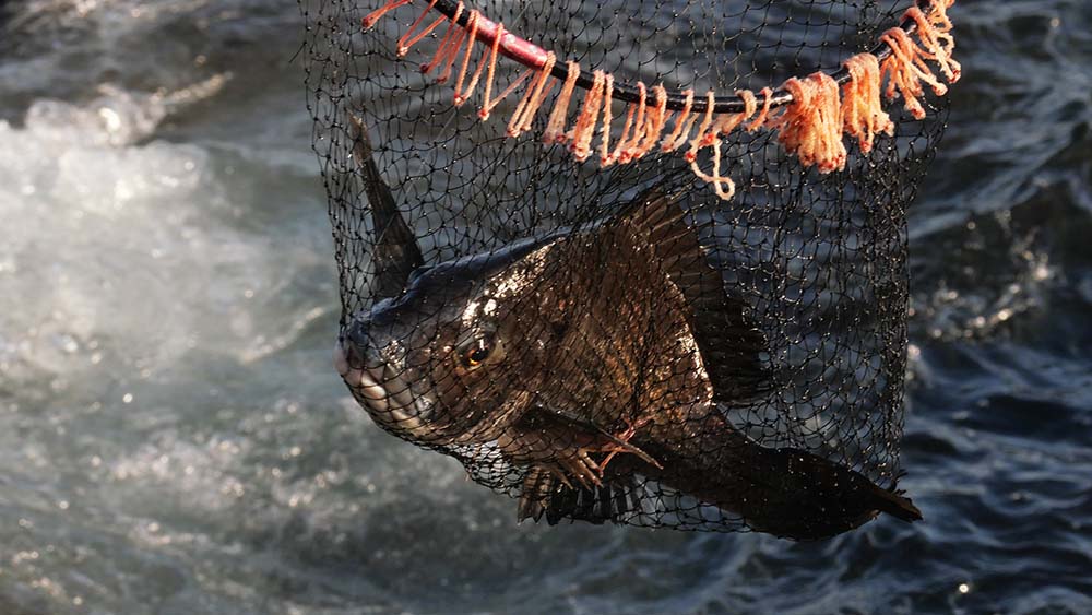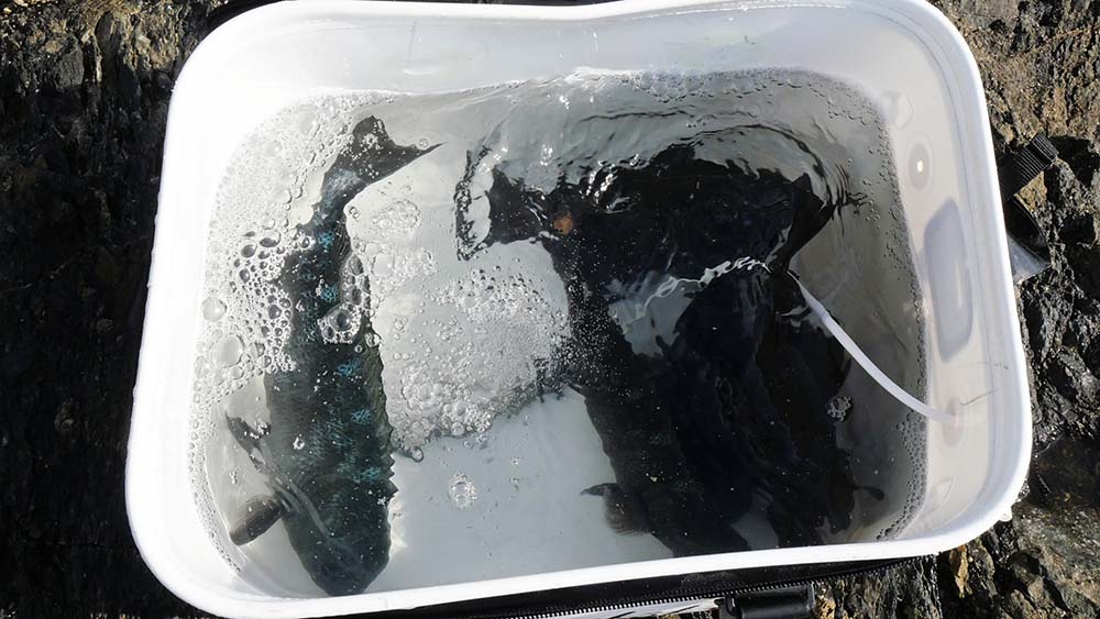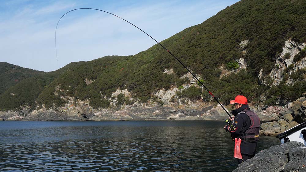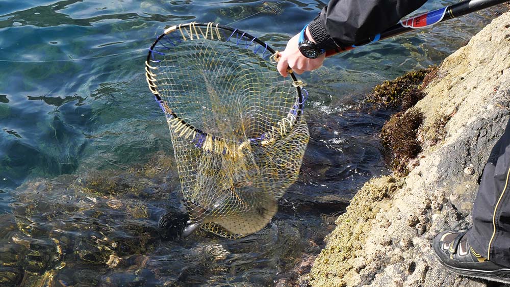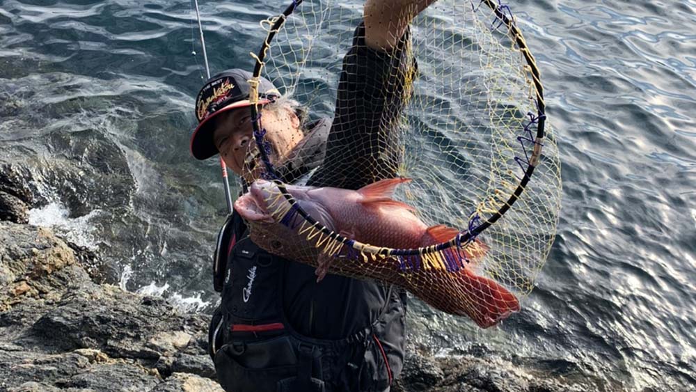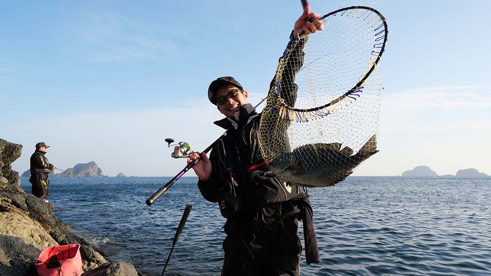 “ゾウセンバエ”でキロ級のグレをタモ入れする師匠、眺めるみどりちゃん