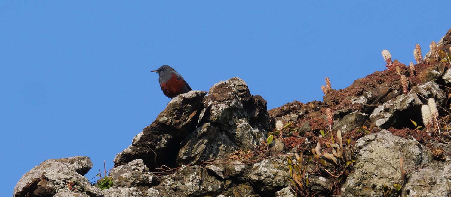 それを見るイソヒヨドリ。花はツメレンゲ(環境省・大分県共に絶滅危惧NT)