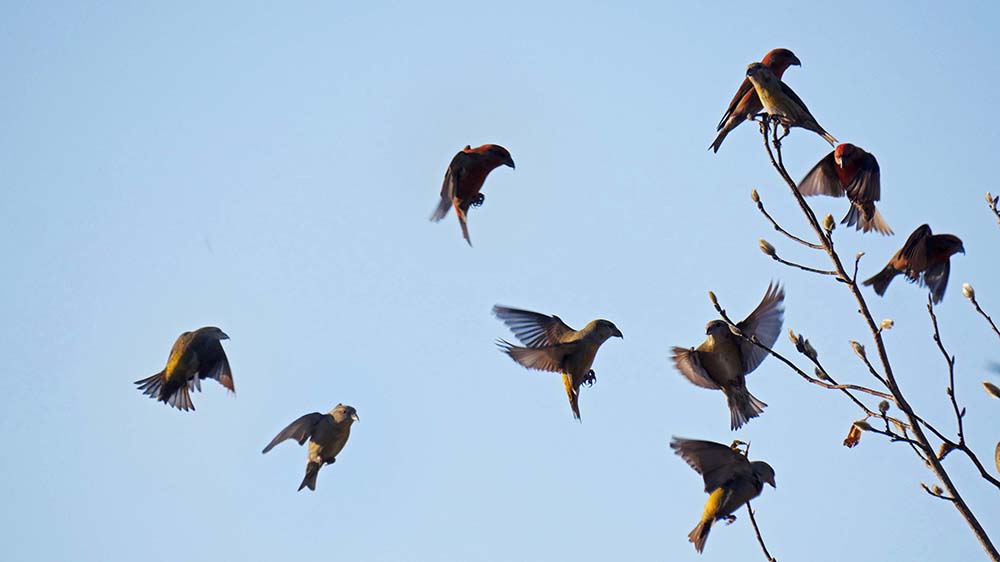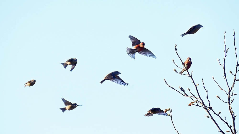 遠くの松の木に鳥の群れが入った。ほぼ確信してシャッターを切るとビンゴ。