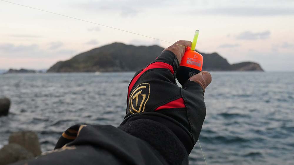 ウキのモンスターフカセナイトは、カンダイを狙う時にカメノテなど重いエサを使う時に使用。また、離島の夜釣りで1~3号の重い仕掛けで大型オナガを狙うのも良い。そしてタチウオの夜釣りやアオリイカの泳がせ釣りにも重宝する。