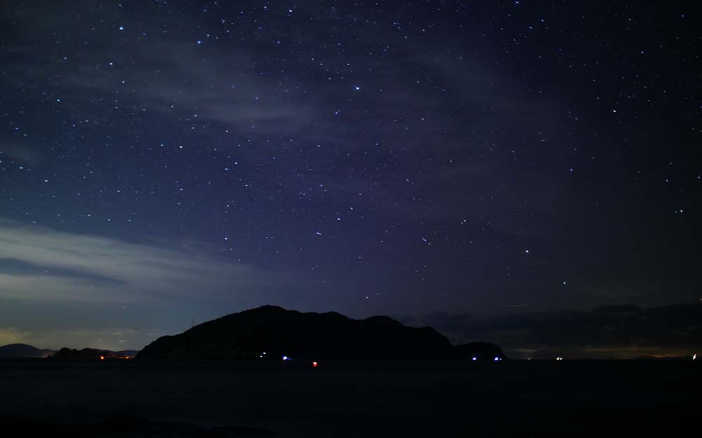 鶴見大島の夜景、水際の白い明かりは釣り人
