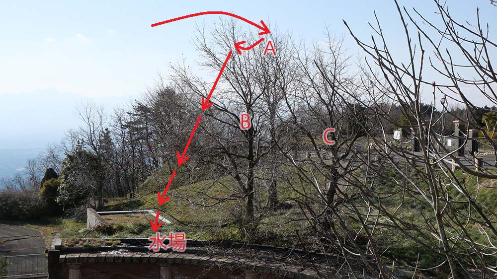 注:Aの木は撮影ポイントから約45m離れた木。水場に来る時に一番良く止まる木で、周囲の安全確認を行う木。Bの木は水場直上の左の木で撮影ポイントから30m。Cの木は水場直上の右の木で撮影ポイントから28mくらい。