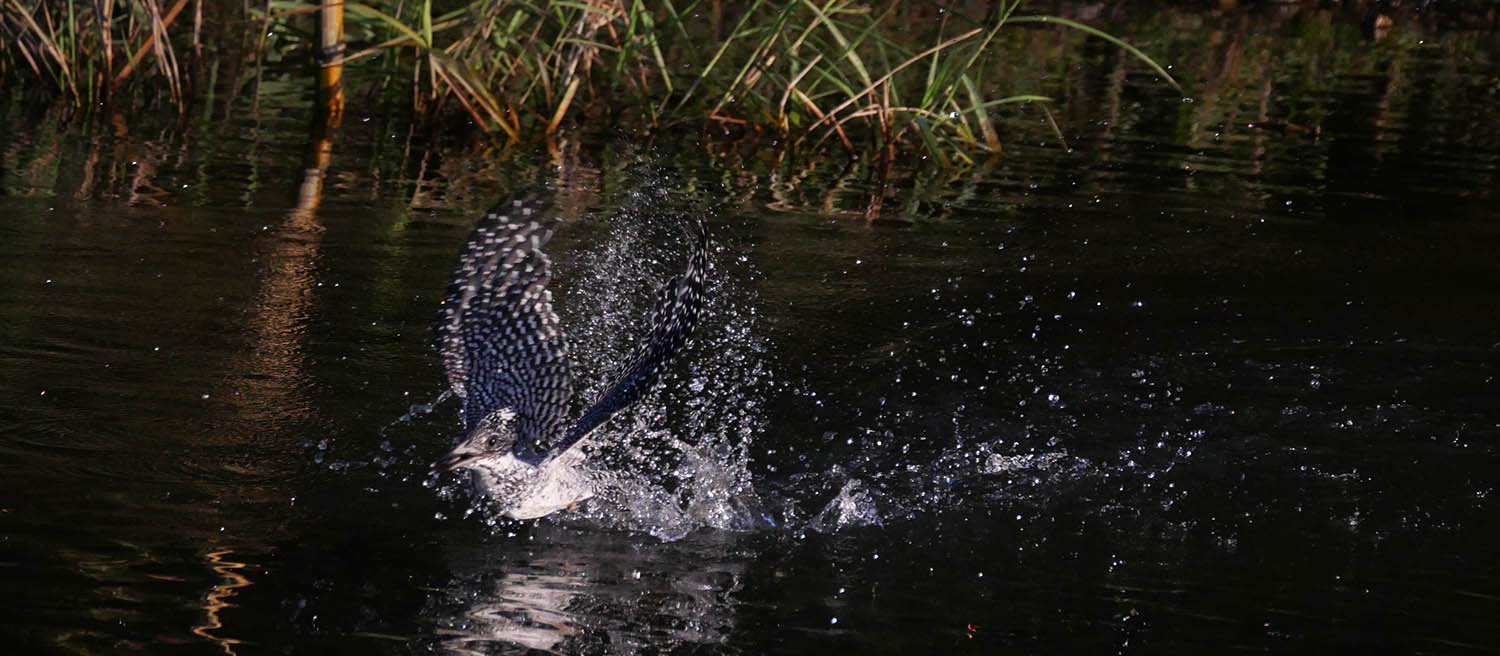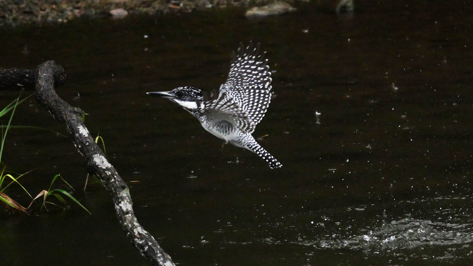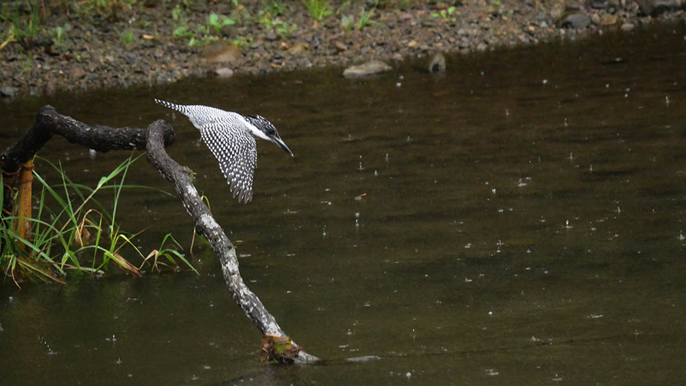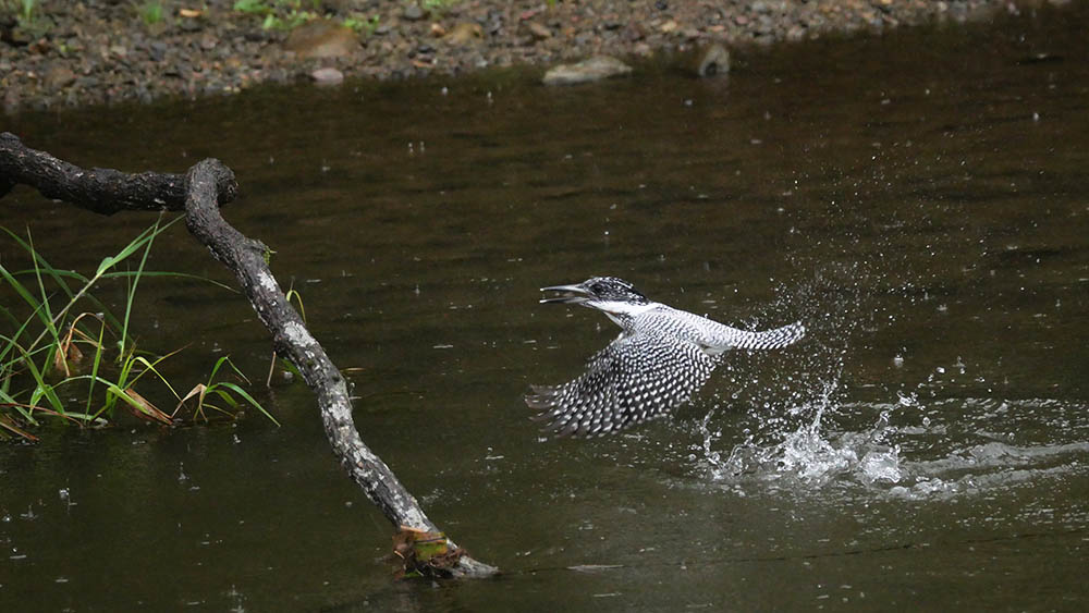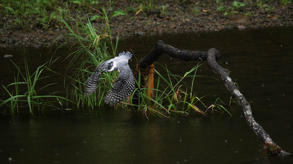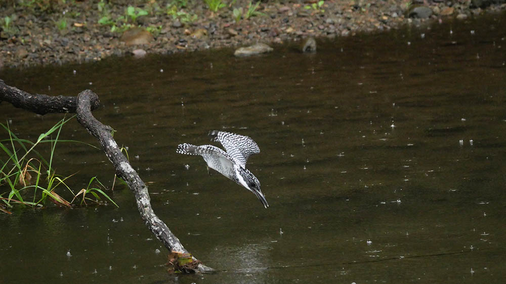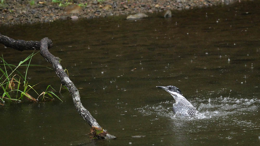 だからレストランと呼ぶ止まり木は、魚を打ち付けられる頑丈な木。尚且つ重い獲物を咥えて飛んで来ても止まりやすい木肌、水面から50~70㎝の高さ。尚且つこの高さは、食事後に行う水浴び(5~6回は飛び込む)にも適しているのです。