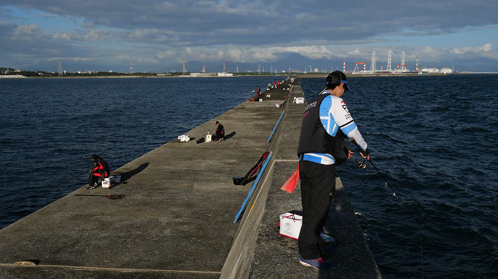 北寄りの風とバリ(アイゴ)の多い縦一文字を考慮すると、横一文字の中央付近が今回のポイントとして最も有力となり、本命の沖向きはやれなくても、湾内向きなら44人が並んでも十分に竿を振れます。
