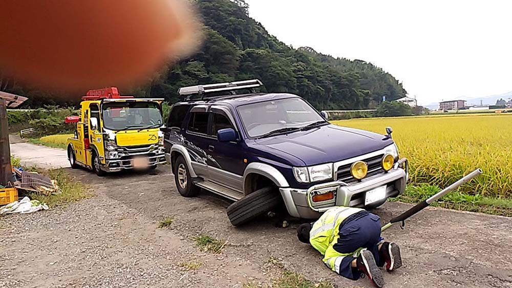 初めて経験するドライブシャフトの脱落。保険会社に連絡してレッカーを頼んだ。レッカー車は入れるけど牽引台車は幅が広いので使えない。ジャッキアップして、外れたシャフトやサスペンション?をチェーンブロックで締めて仮固定。