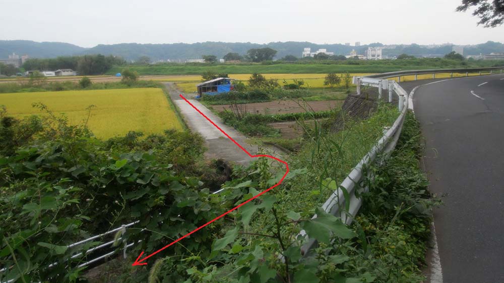 更に発進し、大分川の賀来大橋右岸下流に入るべく、県道から農道へ鋭角にハンドルを切ったら少し重い。水路の橋を渡って50m進んだところでグヮシャ!!