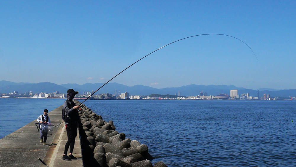 数日前の雨の濁りなのか?防波堤周辺の海の色は茶色に濁っています。快晴の一日だったので、写真を見る限り青い海に見えますが、これは青空が濁り水に反射しているだけ。こんなに青々とした海ではありません。