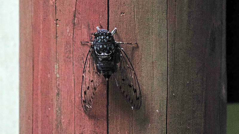 最後に野鳥園で観察すると、ミンミンゼミが近くで鳴き始め、探していると看板の支柱に止まっていたのでパシャリ。その他のセミはツクツクホウシだけで、ヒグラシ・ニイニイゼミ・クマゼミなどの声は終わっています。