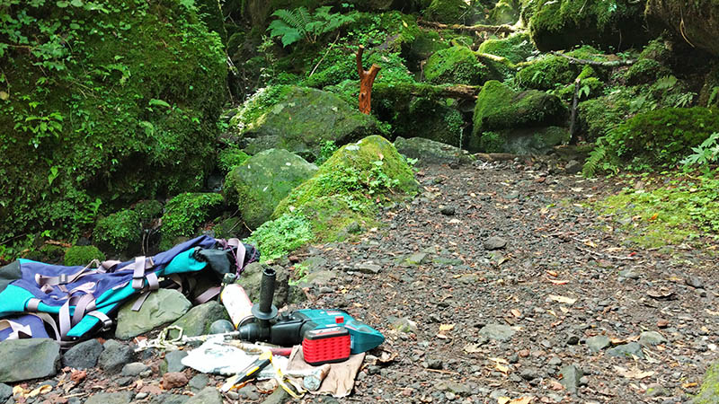 足場の悪い所を進み、そのゴミを拾って“かくし水”に到着です。