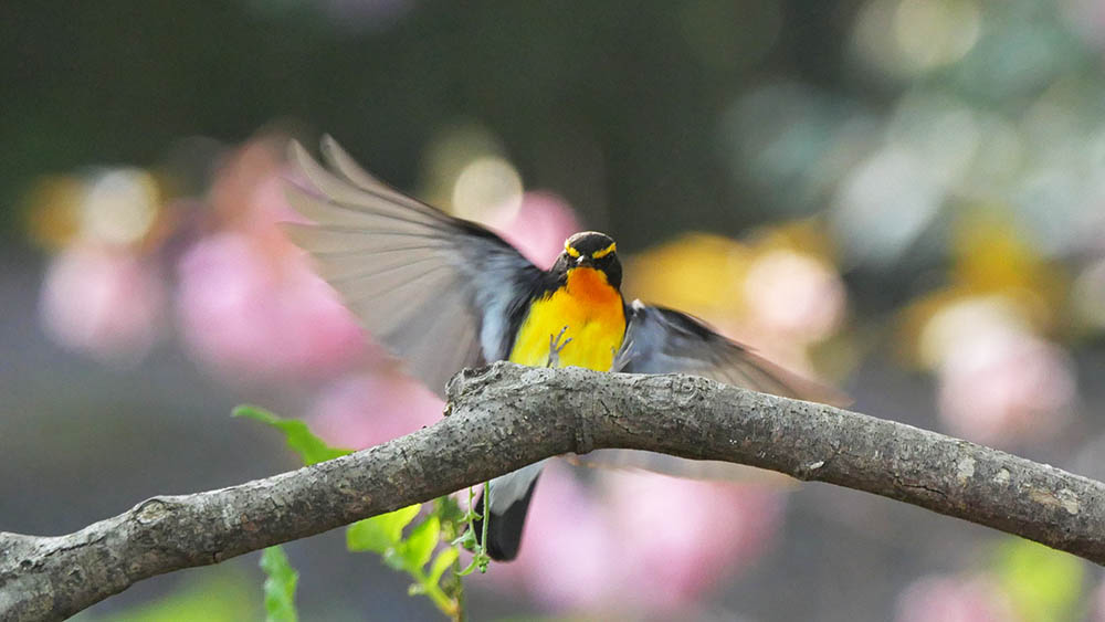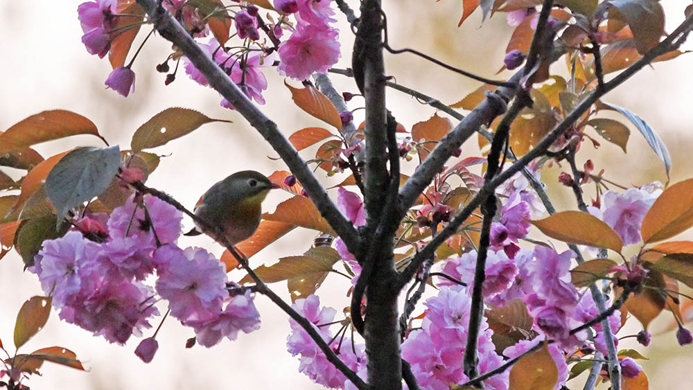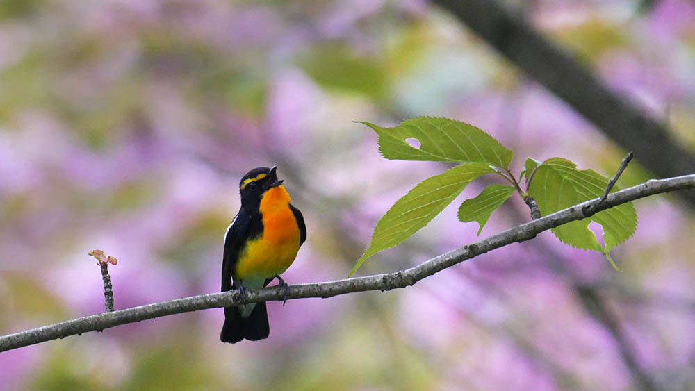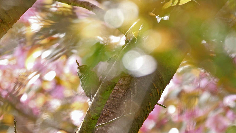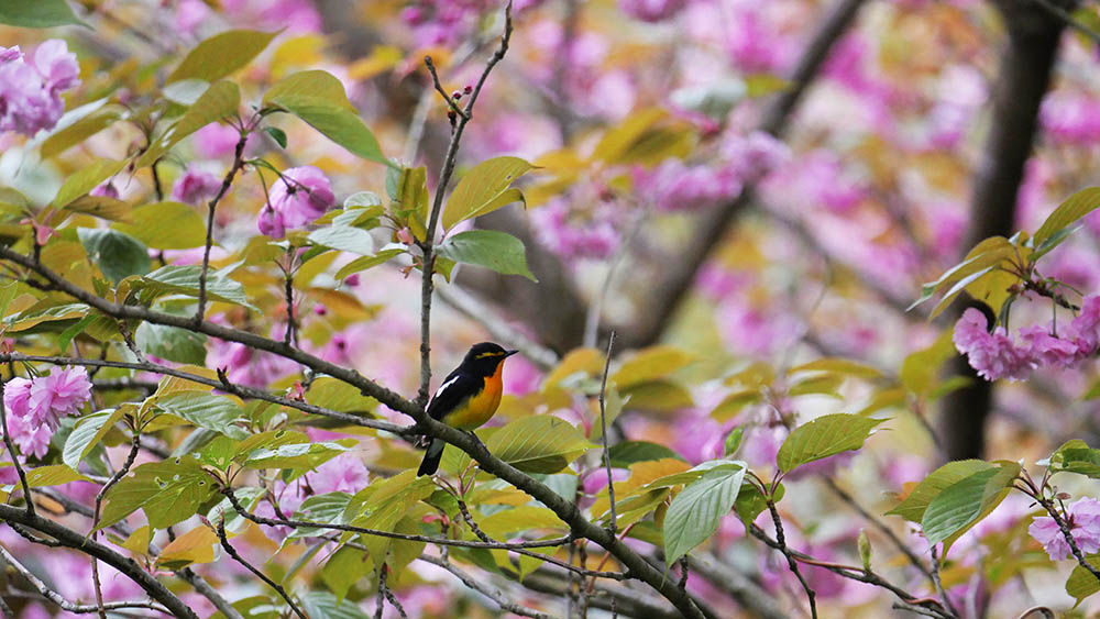 ボタン桜とのコラボに挑戦しているキビタキ