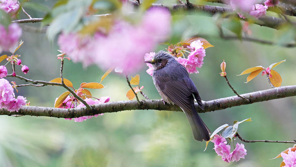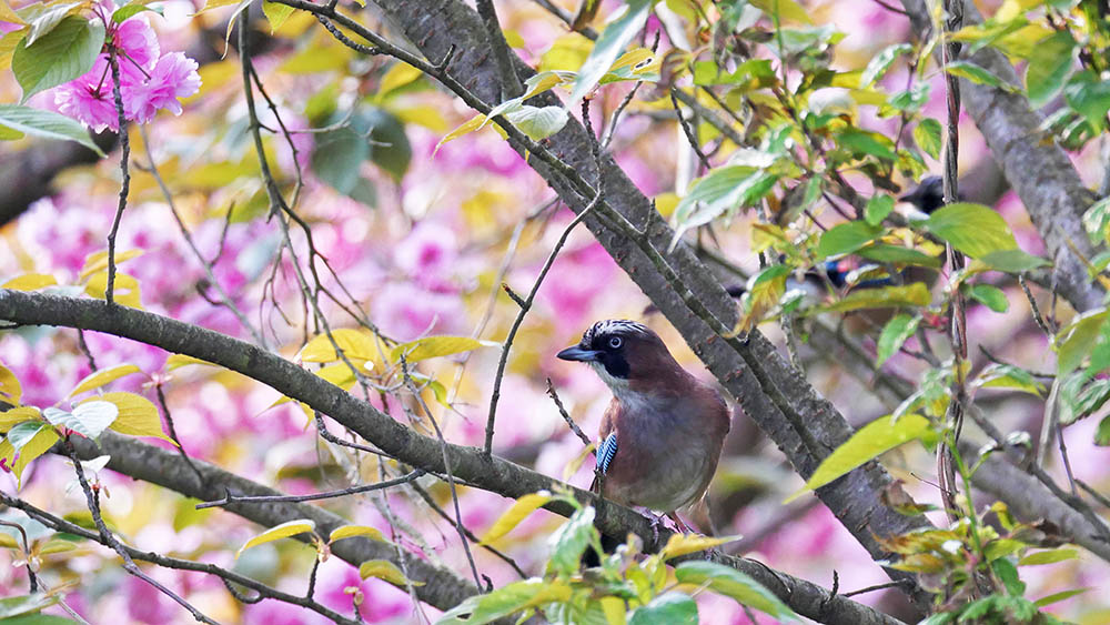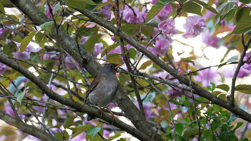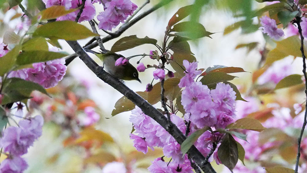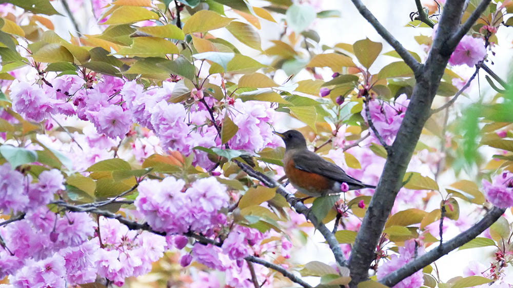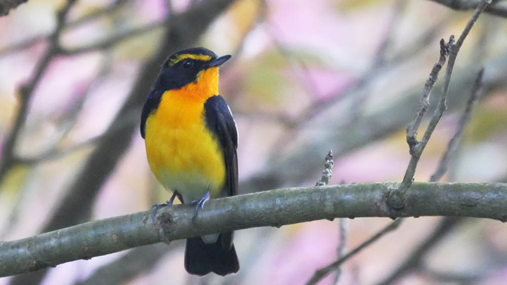 ボタン桜とのコラボに挑戦しているキビタキ
