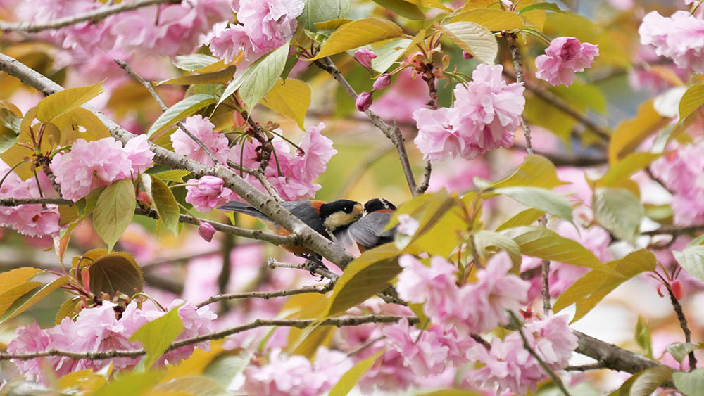 ヤマガラ(留鳥) 花の中で愛を語ります