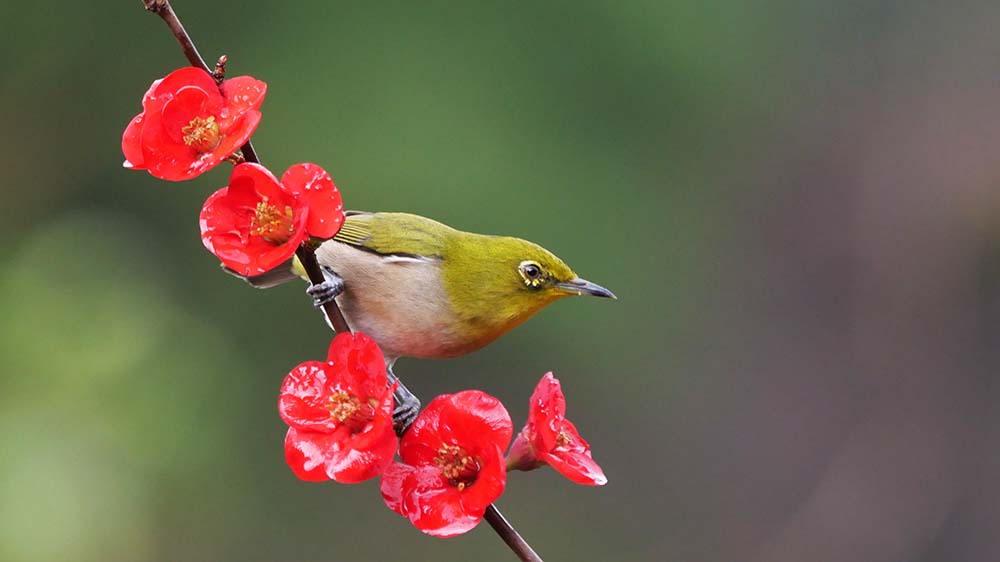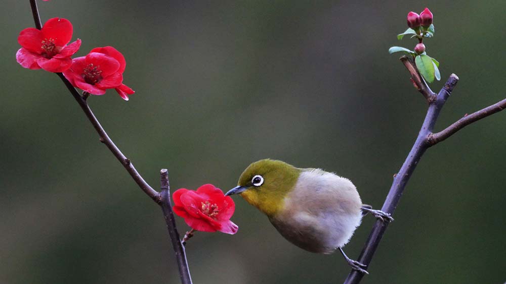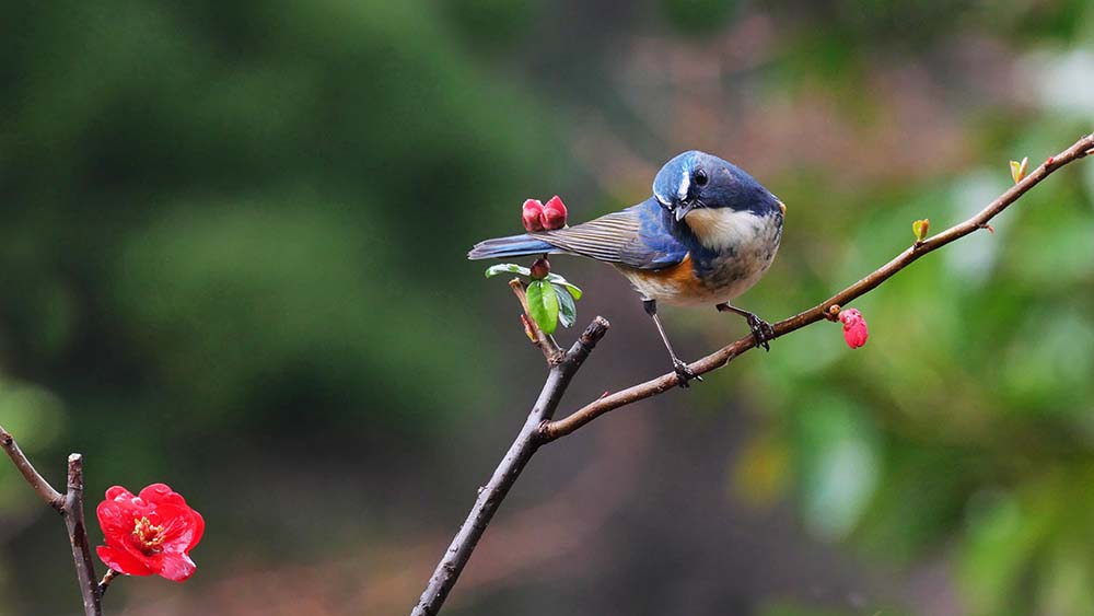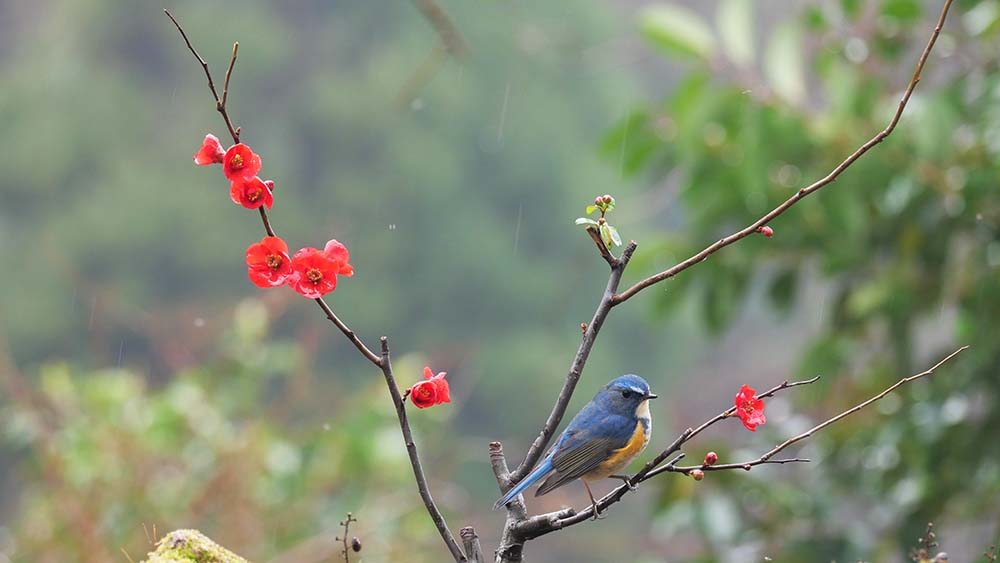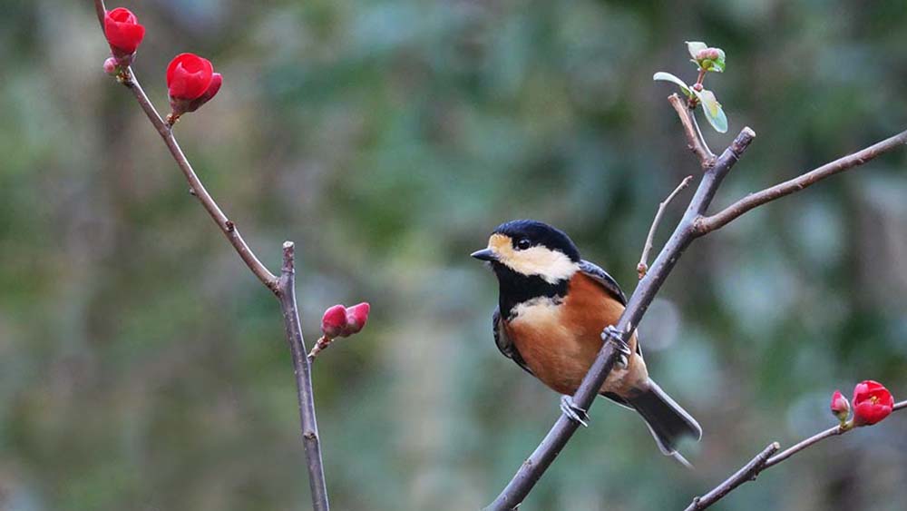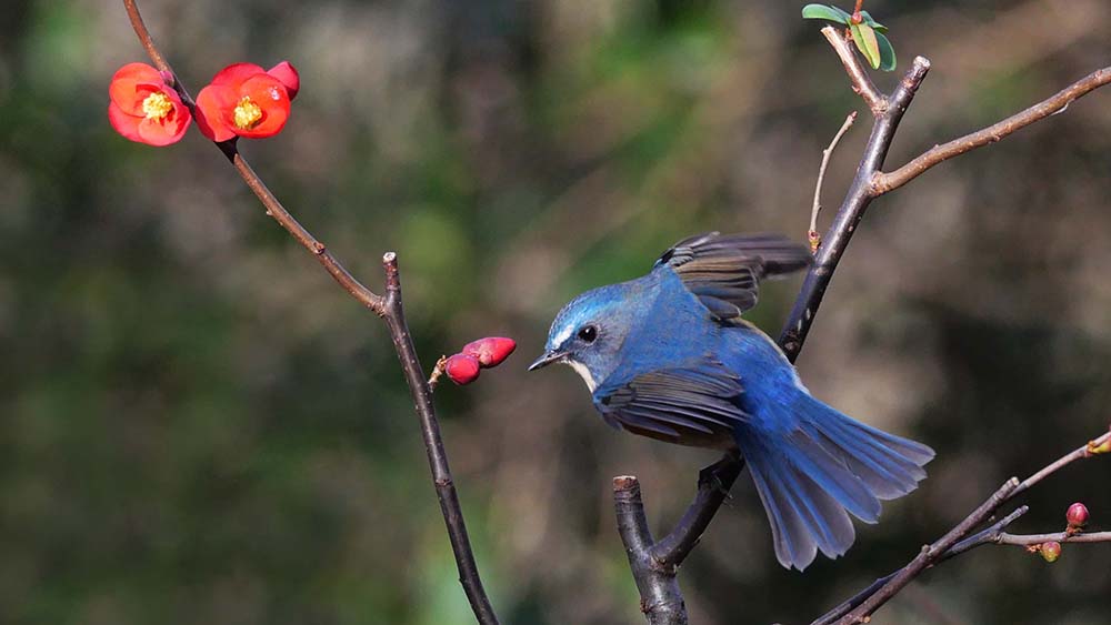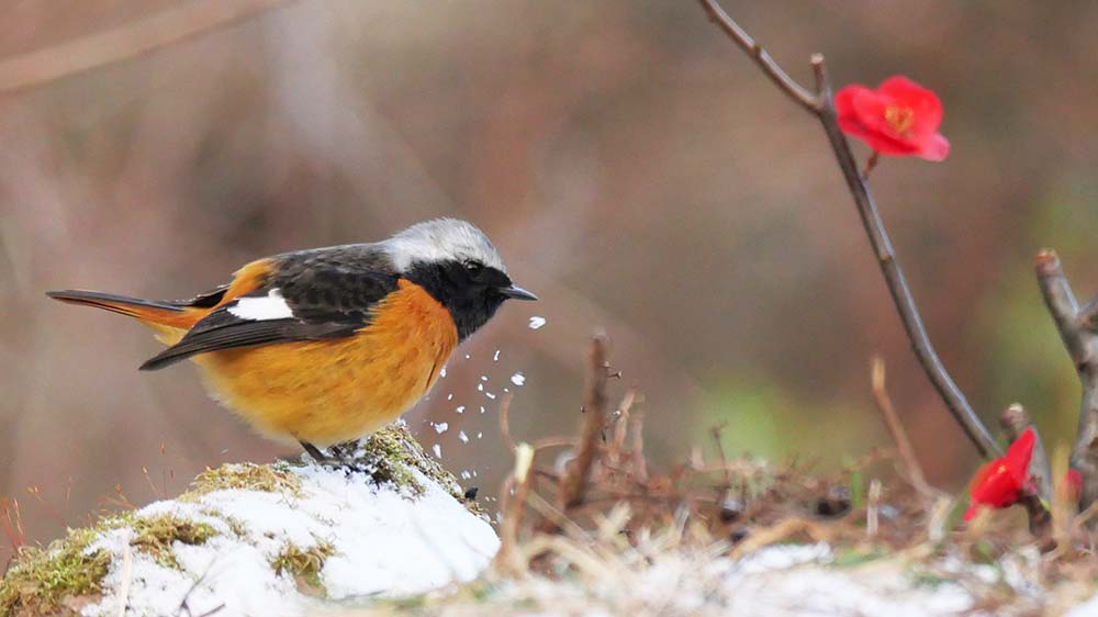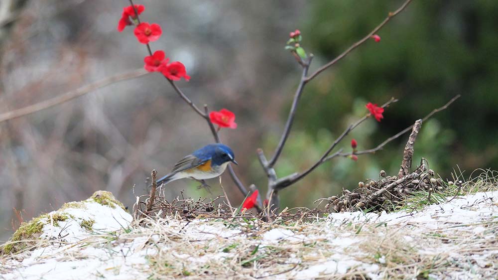 ハゼの実で餌付けているルリ男を、更にご馳走のミルワームに餌付け、ボケの花とのコラボ撮影をしようとしましたが、ルリ男はミルワームに餌付かない。