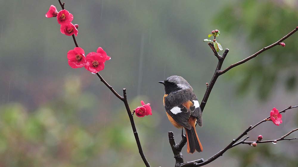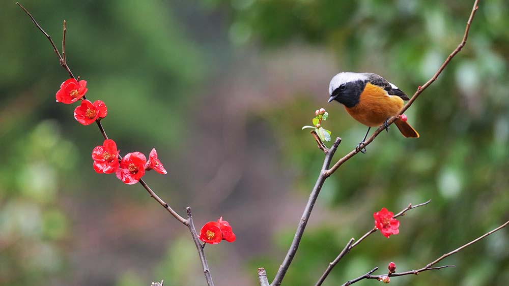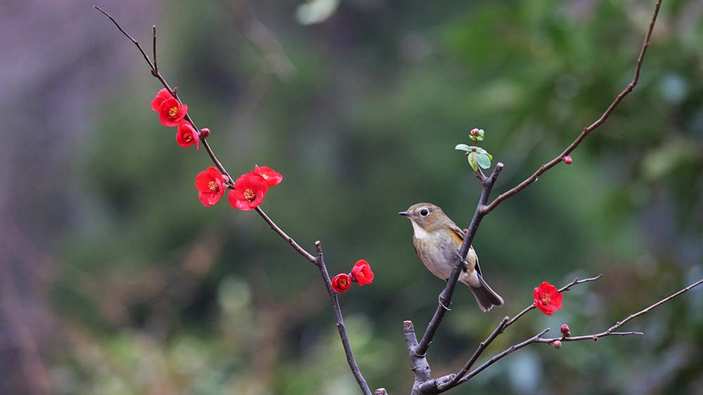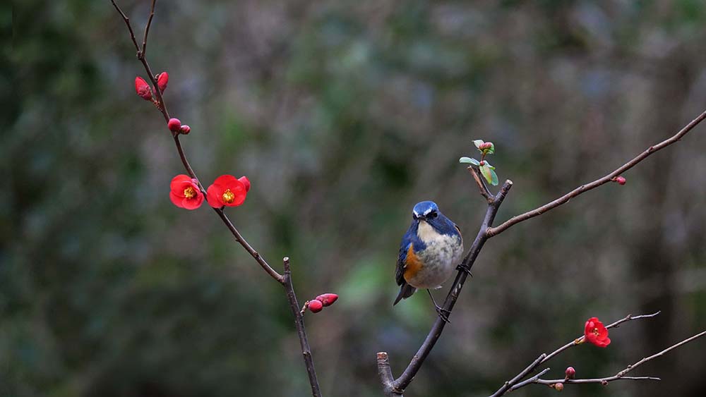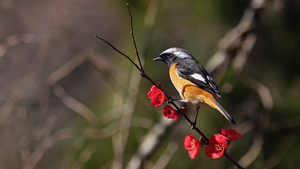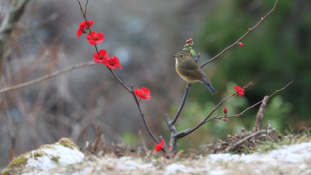 以前からの構想で、ボケの花に止まるルリビタキを写したい。