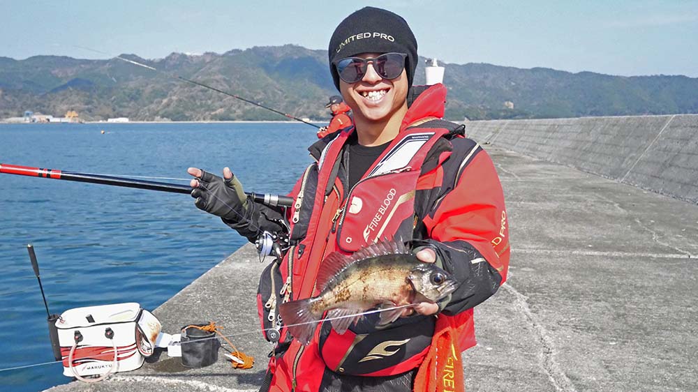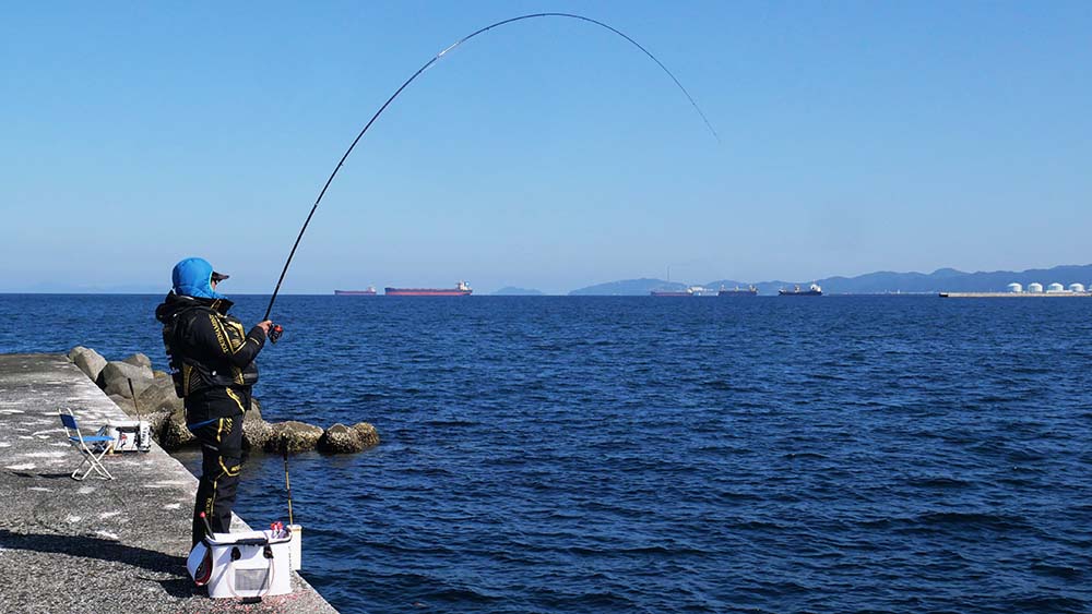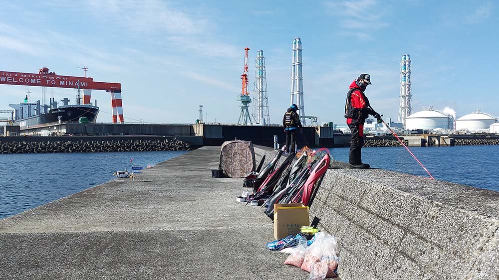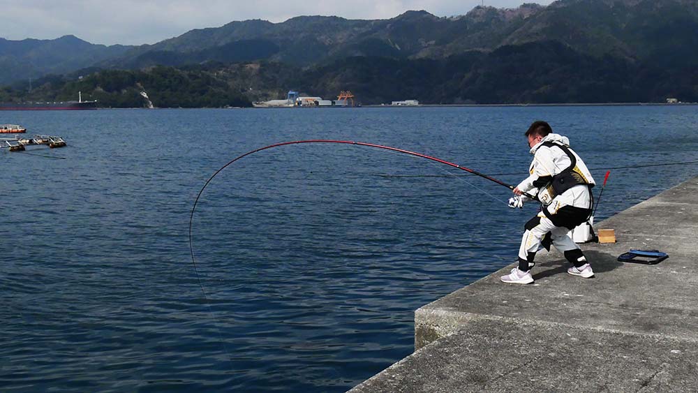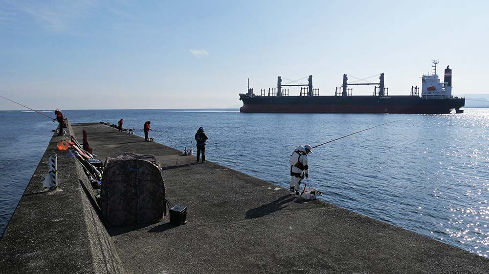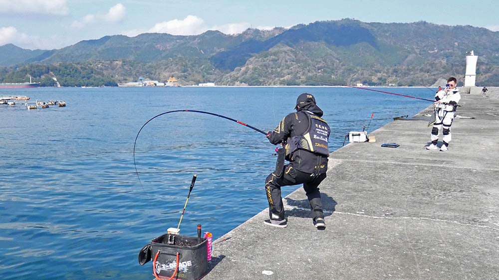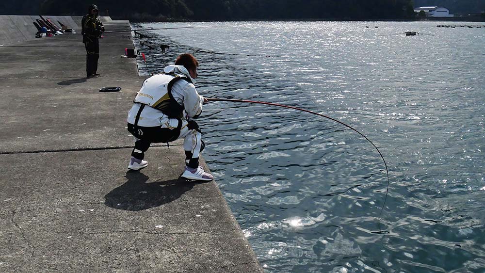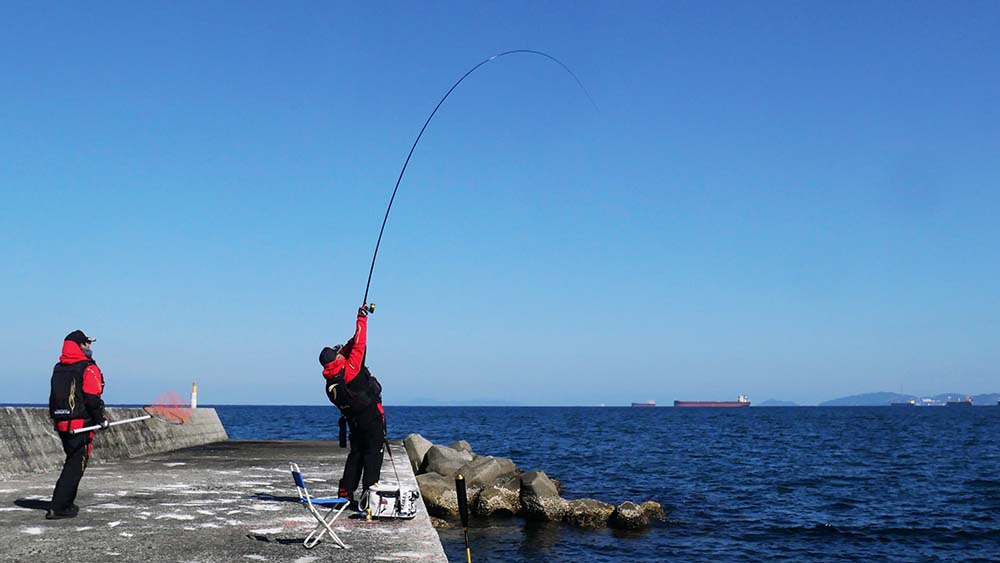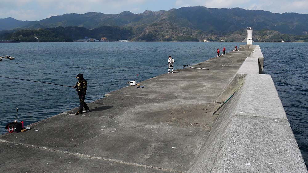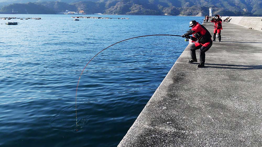 9時出港~17時納竿の工程で、一文字の真ん中に降り立ちました。前半は灯台側狙いで後半は地側狙いです。2名一組で30mおきに3ヶ所で竿を振って頂きました。