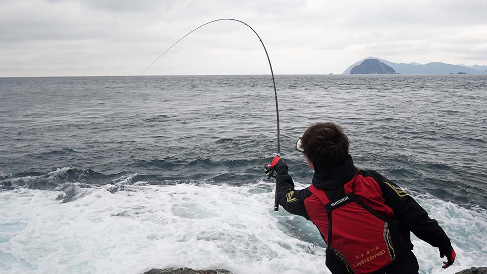 今回は横島一番で参加者たちと釣って欲しい・・そんな主催者の思いを胸に5名で上礁しての釣り。昨日からの東のウネリはまだまだ高く、釣り座が限定されているので、午前中の私は竿を出さずに監視員兼アドバイザーに徹します。