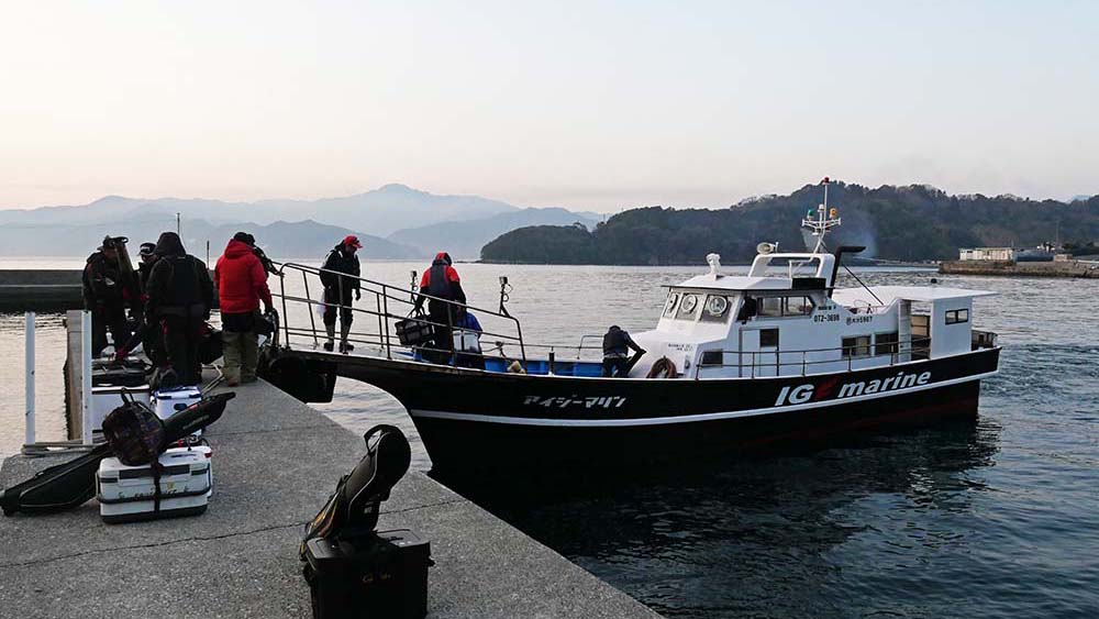 6時出港~14時納竿の工程でグレ2匹の重量審査。私は抽選で27番、馬場さんと北村君の3人で白子島の水道へ降り立ちました。釣り場を説明した後は遠来の二人に釣ってもらうべく、10時までは竿を振りません。