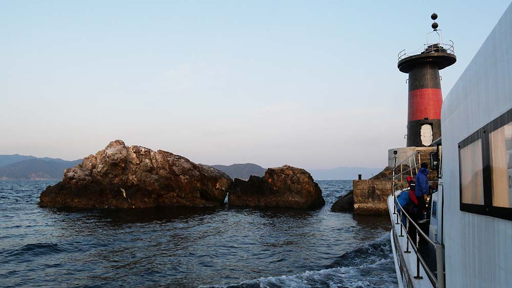 沖を向いて右の細い防波堤から荷物の積み込み