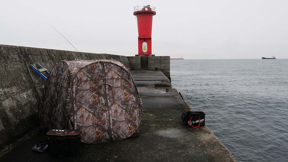 雨予報は無かったのですが、出港前から冷たい雨が落ち始めたので傘を準備。これが正解で、二人の釣りを見ながら雨や霙を傘で凌ぐ事が出来たのです。