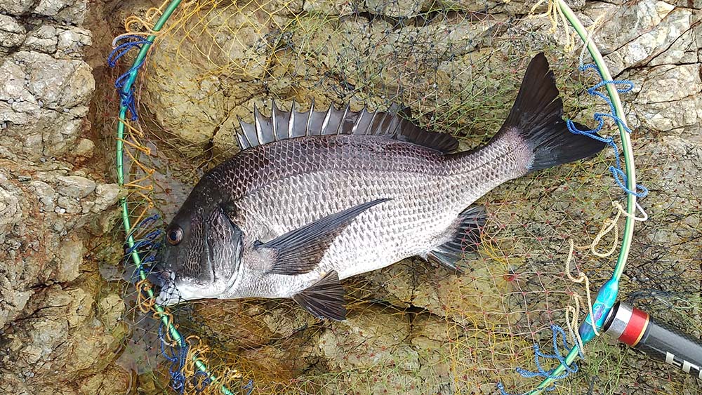 私は10時30分頃からマキエを作り、1時間くらい竿を振ると真鯛の仔が2匹。その後昼食をとって午後からの釣りでは、13時過ぎに北村君に待望のグレ、続いて馬場さんに小型マダイ、さらに私にはチヌが来てくれて納竿となったのです。