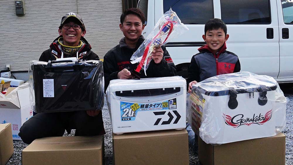 全体的な釣果も伸びておらず、47名の参加者で検量は12名、その内規定の2匹を揃えていたのは僅かに5名のみ。なんとその中に、石川健ちゃんの次男坊の陽由(はるゆき)君(小6)が1800g で3位入賞の快挙。ビックリでした。