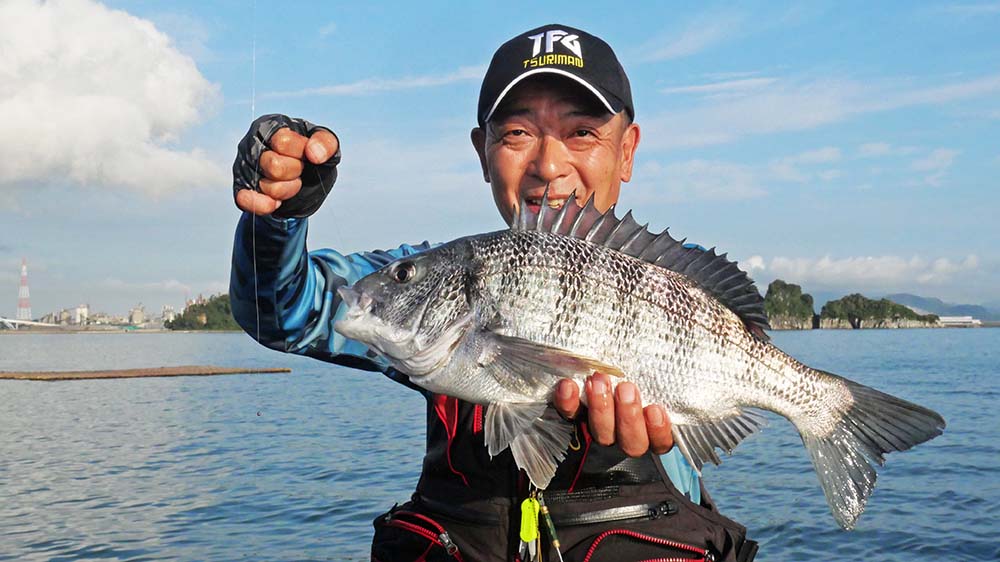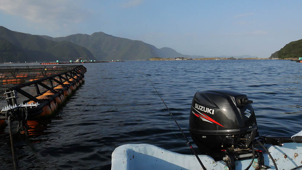 早朝7時には丸二水産に到着、北寄りの強風が吹き荒れる中、対岸のいつものポイントへ。1時間30分ほど竿を振ってマダイのアタリは一度もなし。次は同じ水産会社の沖から避難してきた生簀周りを攻めると、確か4投目でマダイが来たのです。