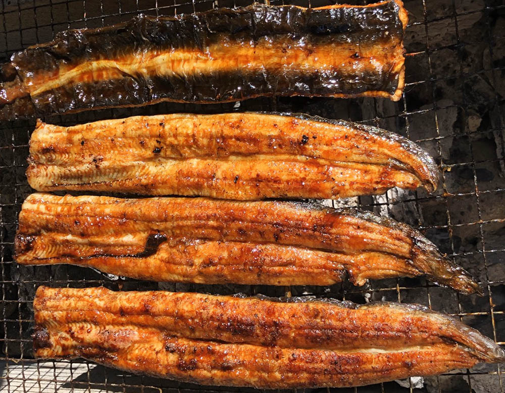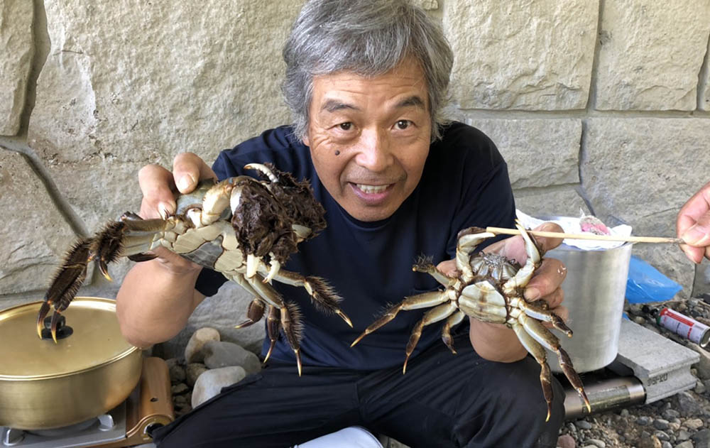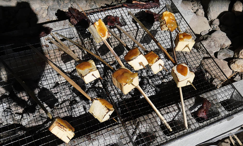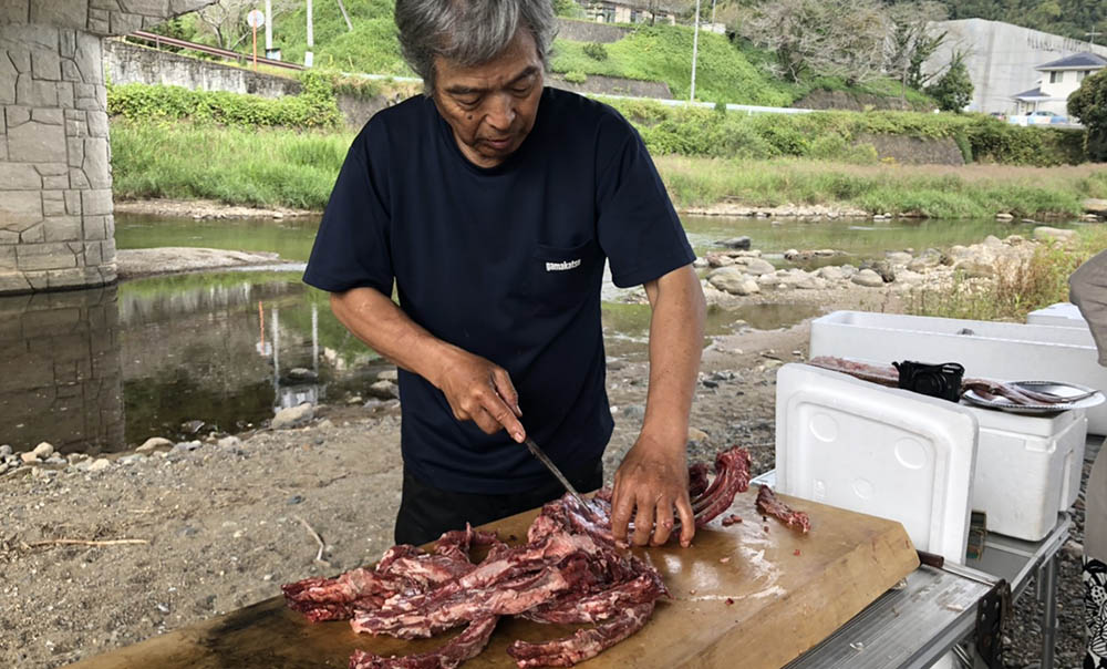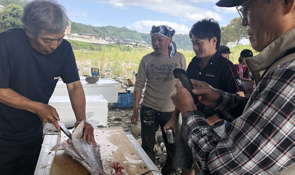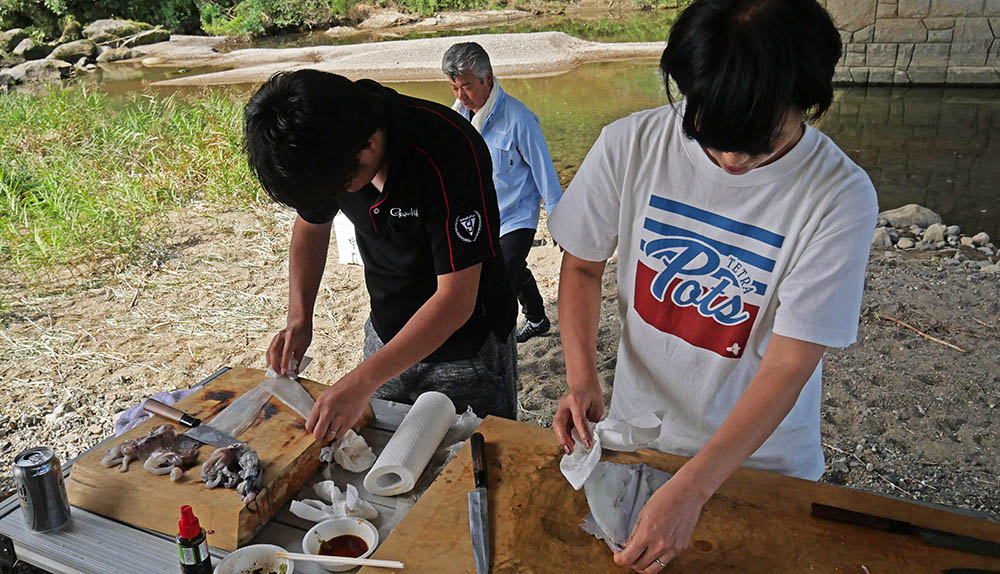 食材は、猪鍋約40ℓ・スペアリブ焼きと茹で・大型マダイの刺身・七瀬川の天然ウナギ・大野川と七瀬川のモクズガニ・剣先イカ刺身・グレの一夜干し・郷豆腐の田楽・焼き鳥・焼きそば・おにぎり・アケビ・秋の果物などなど。