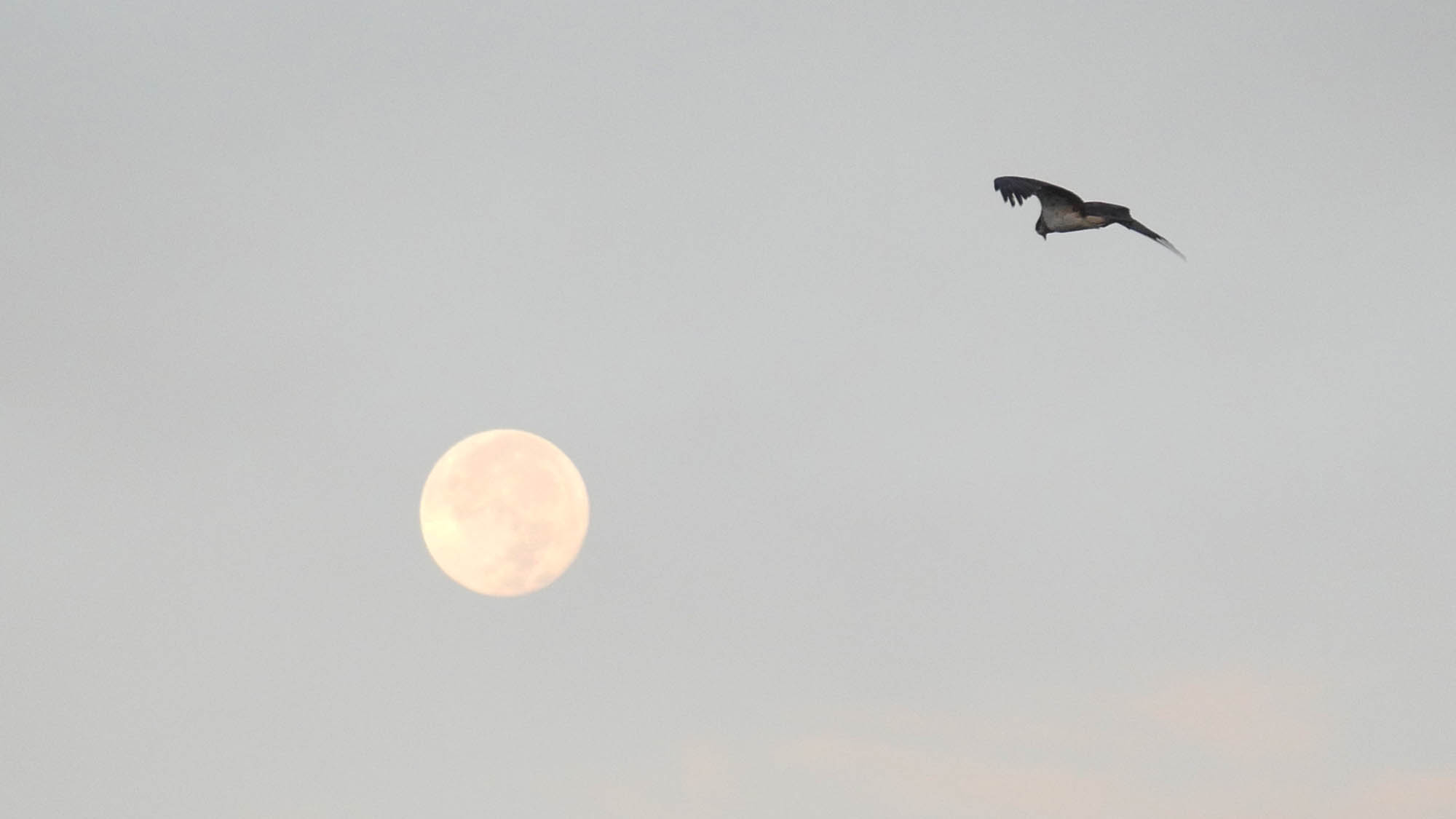 皆が写している通過中のノビタキ(夏鳥)を私は写していないので、今朝は大野川へと足を延ばしましたが見つけることは出来ませんでした。代わりに写したのは月の傍を通過する、留鳥のミサゴだけ。
