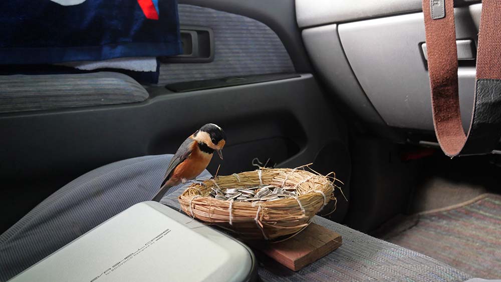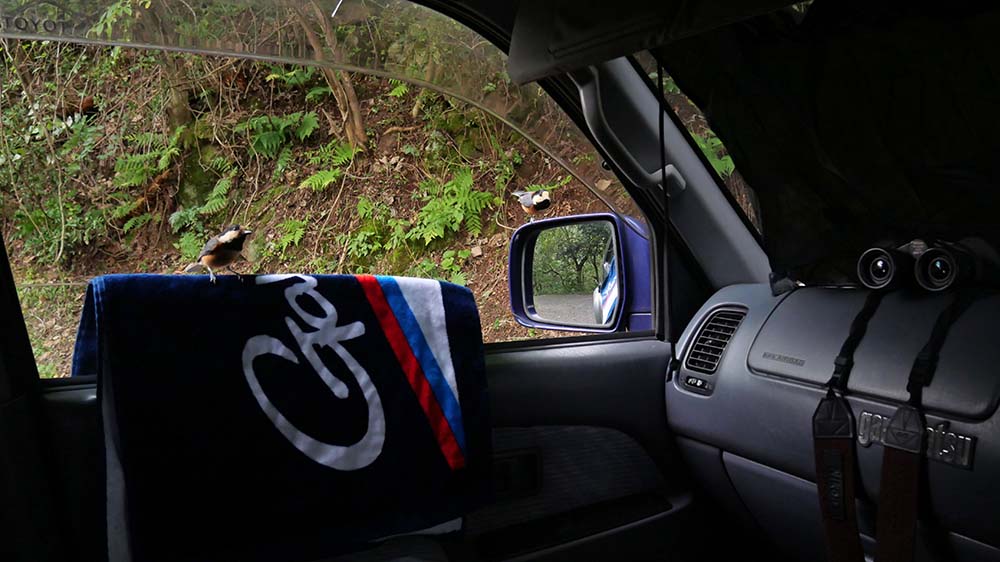 車中から他の鳥見をしている時の一コマ、私の口からでもエサを取ります