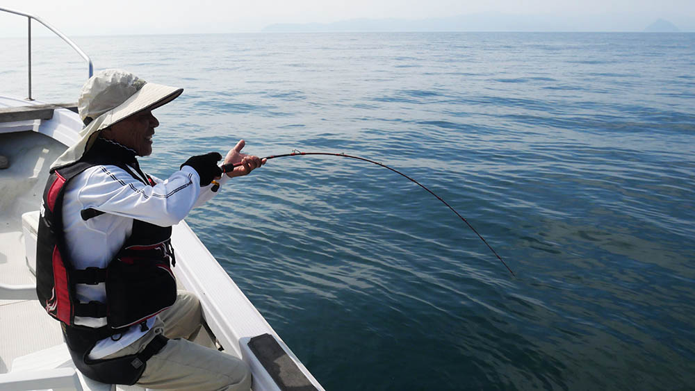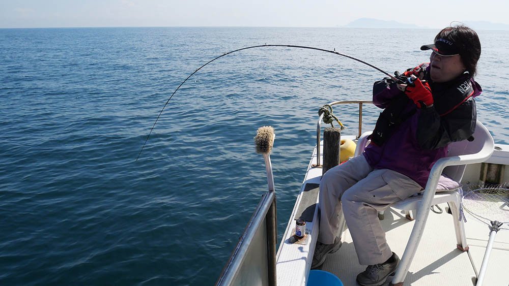 リールをゆっくり巻く釣りは私には向いていないけど、店長に誘われては断れない。臼杵から店長の知人の船で朝9時に出港、大潮の下げ潮狙いです。