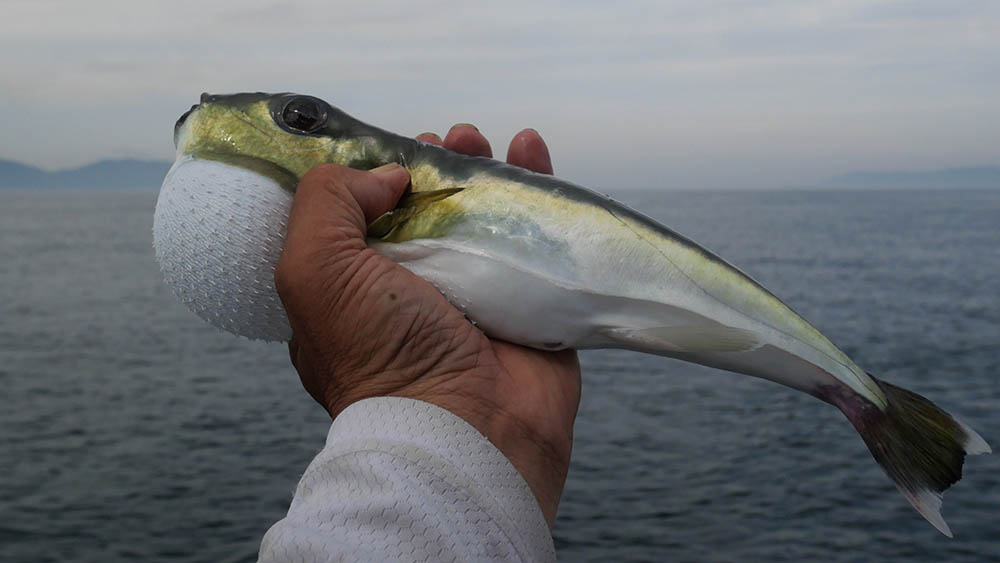 12回のアタリ、アワセを入れたのが4回、1回は掛ってヤズ(ブリの小型)の様でしたが、4号くらいのリーダーがプツン。フグの傷があったのか??もう1回は途中で鈎外れ。後の1回はアワセが効かなかった。フォール中のアタリを合わせると、サバフグで釣果はこの1匹だけで終了です。