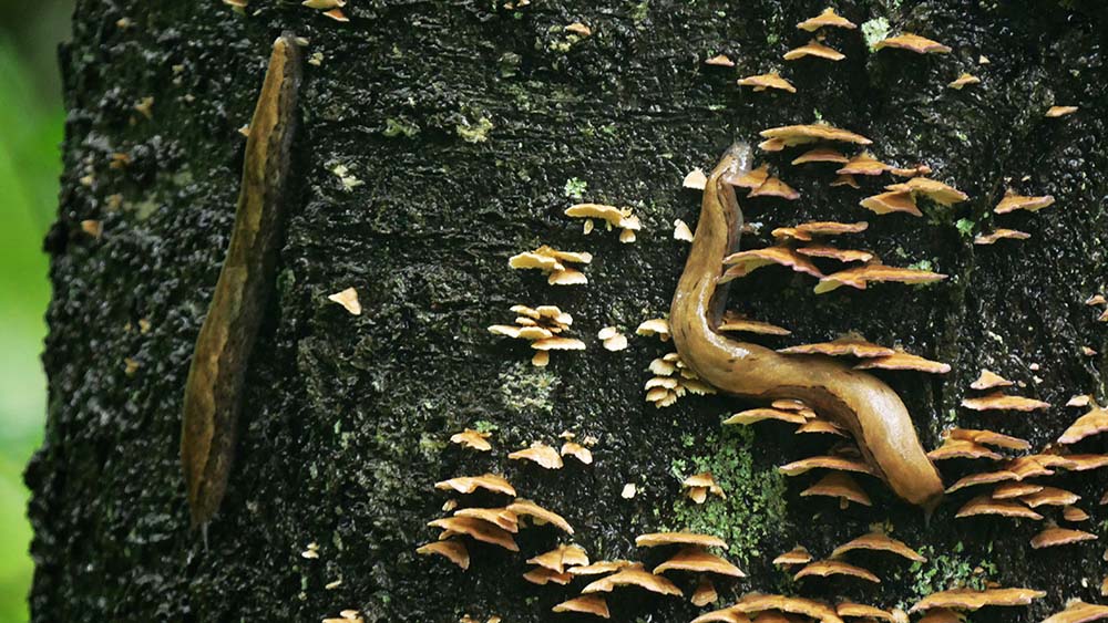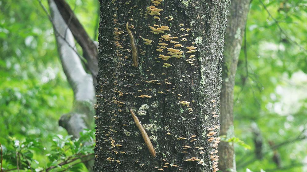 枯れ始めた木の幹にはキノコが生え出すので、ナメクジの食卓は賑やか?