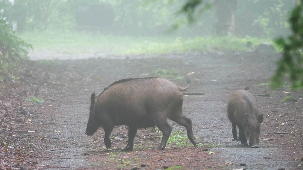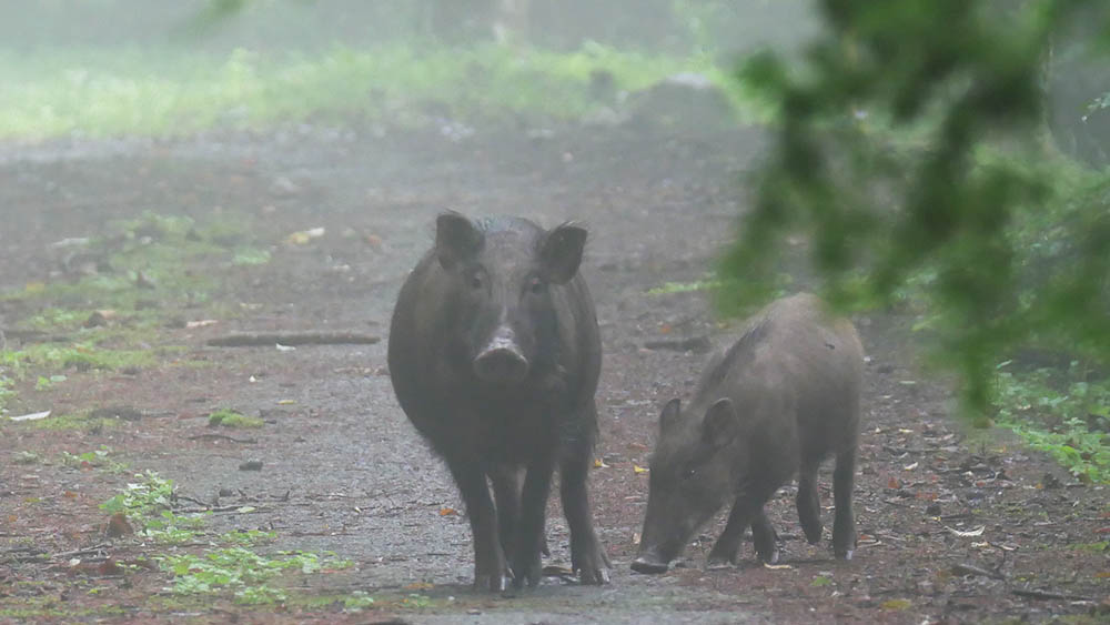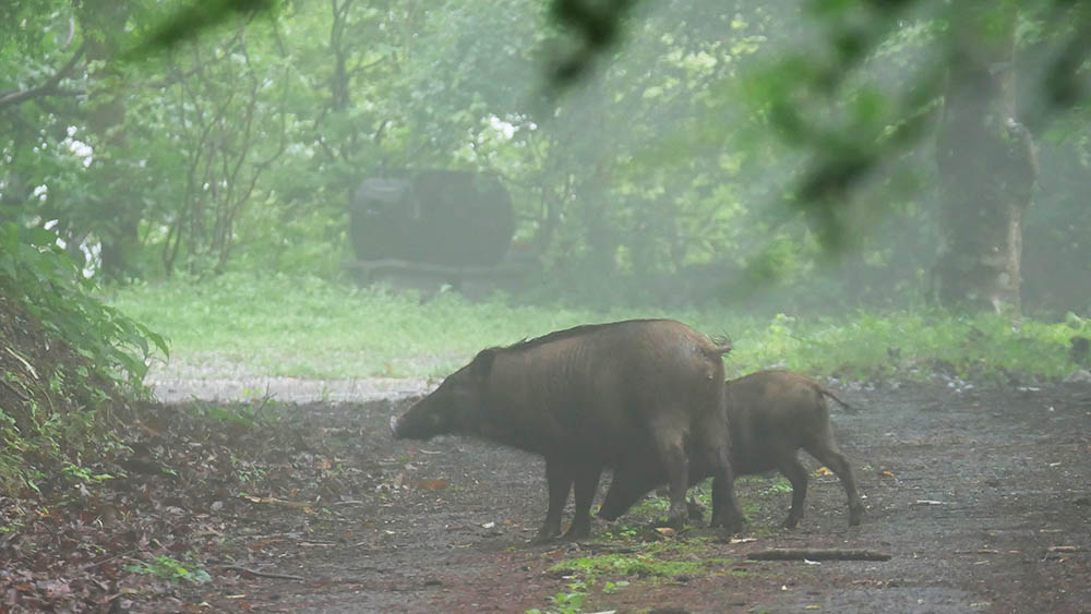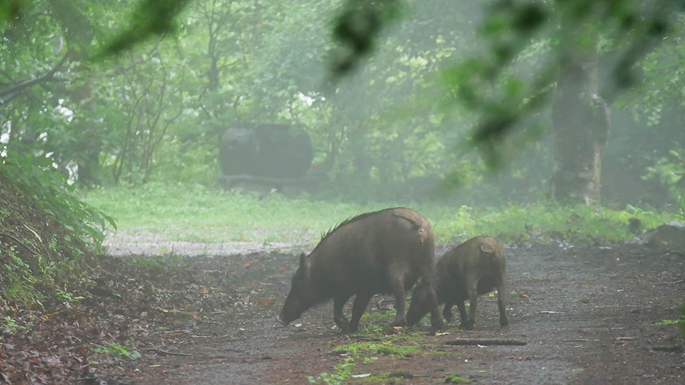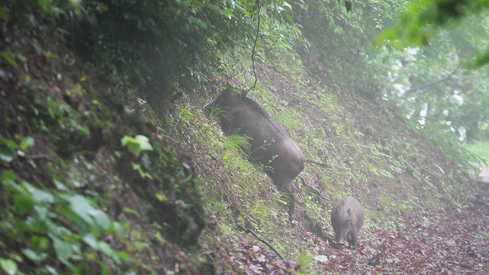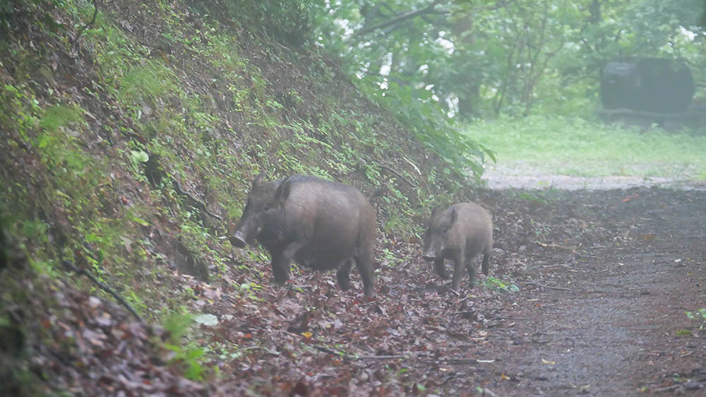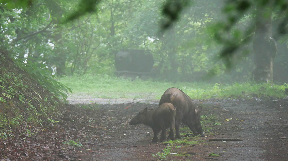 昨日もちょっとだけ姿を見せた80㎏級?の猪が、今日は子連れで出てくれました。