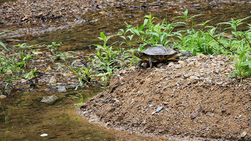 ミシシッピアカミミガメが丘で休んでいたり