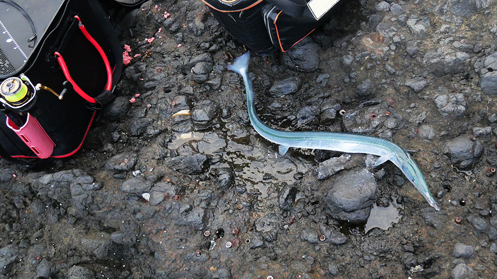 3ラウンド目は一番左端。風と波が無ければ先端の岩から得意の本流釣りが出来るのですが、今回は封じられてしまっており、やむなく波の来ない足場から本流への引かれ潮狙い。中型オナガなど取り込みましたが、相当に大きな魚か亀?を掛けて2分少々でぶち切られ。