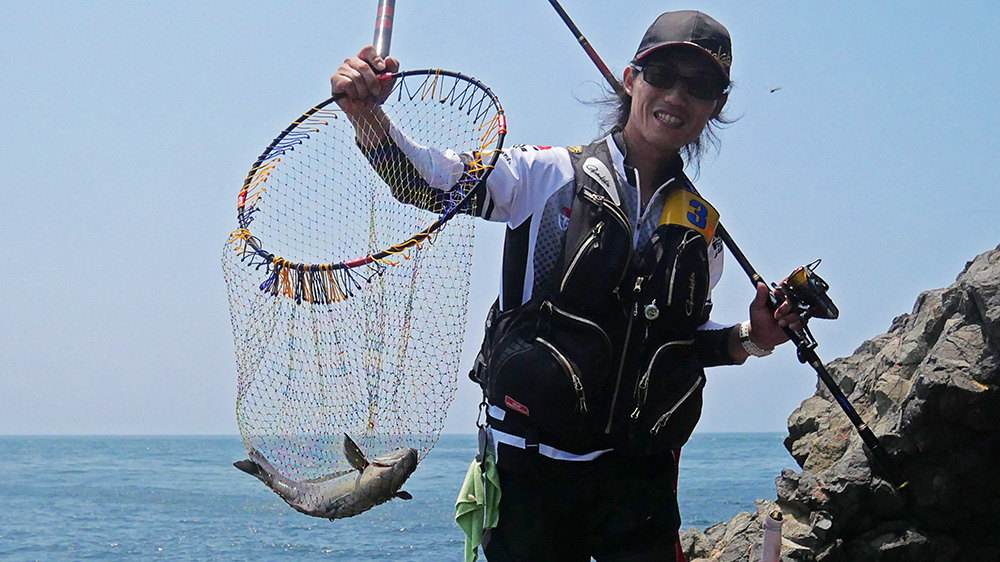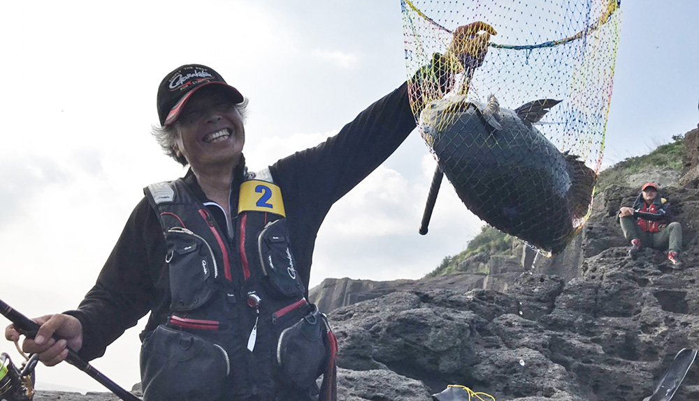 私は韓国のハンさんと、熊本の北村君とモトバン横で対戦。最終ラウンドで、強運としか思えない46㎝位のグレを磯際でゲットして、二人に逆転で勝てたのです。