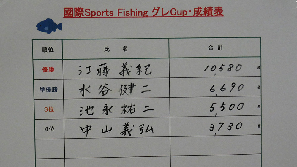 二日目は11時まで大物釣り懇親会、12時40分過ぎから4人の決勝戦が始まりました。