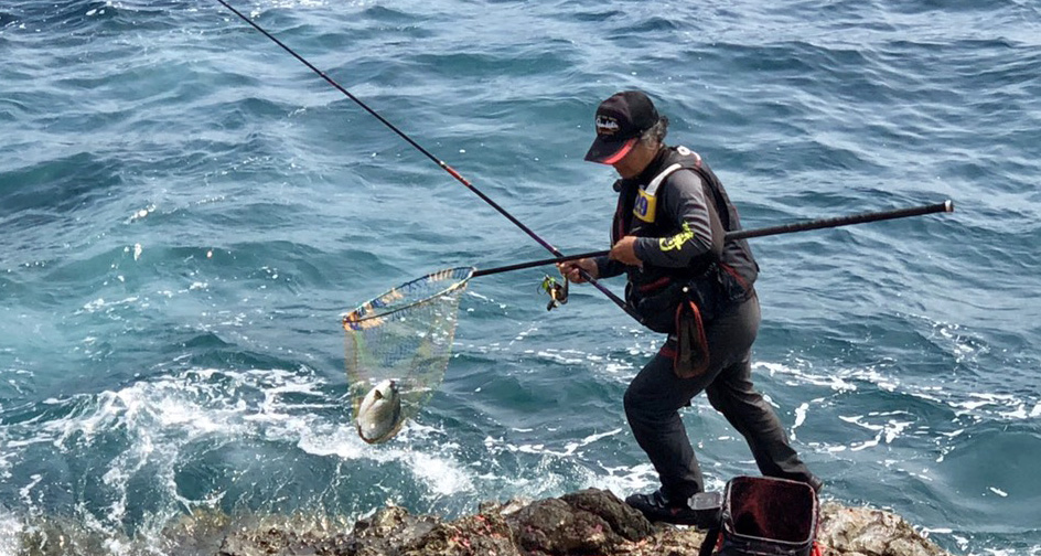 最後の最後に磯の割れ目で二人の元へは辿り着けません。しばらく待って声を掛けると二人とも驚いた様子。釣れていたのは未だマキエが効いていない時間帯なので、コッパグロに終始していましたが、帰港後の検量では結構な良型を揃えていましたよ。