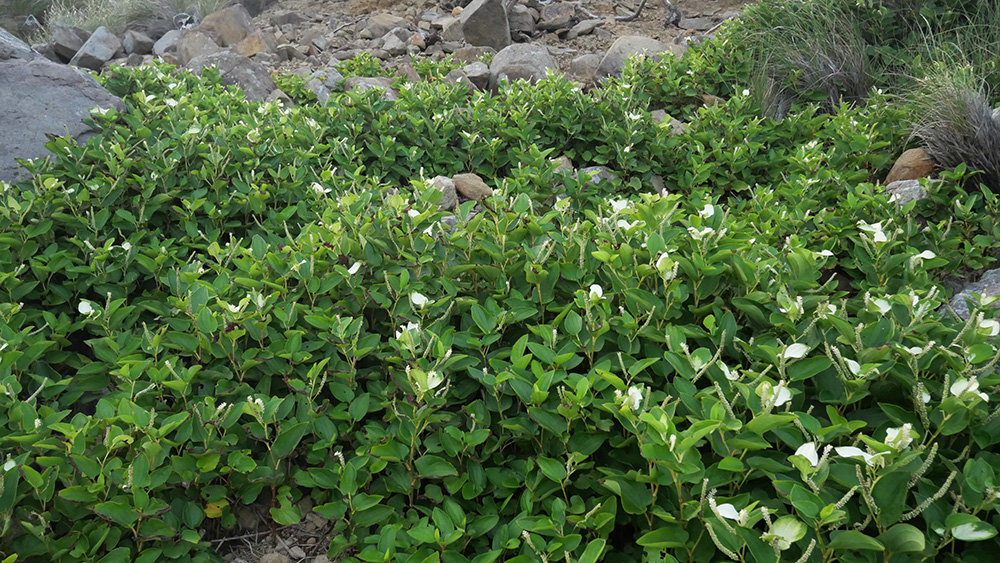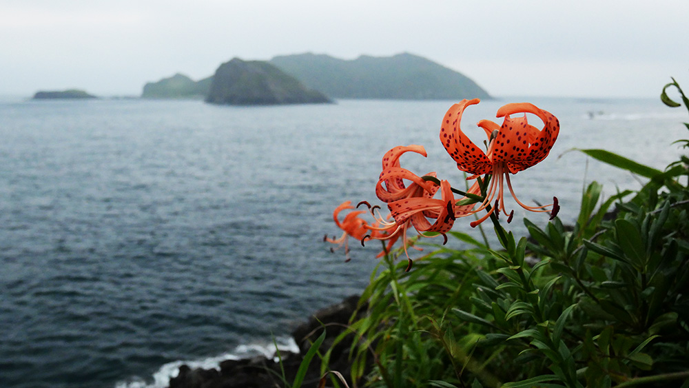 向った先は宮村さんと八反田さんが竿を振っている磯で、地図上では約150m程離れています。崖を越えたり海岸近くのゴロタ石群を歩き、ハンゲショウの花など撮影し、崖から転落した?と思われる雄鹿の骨を越えて慎重に歩を進めました。