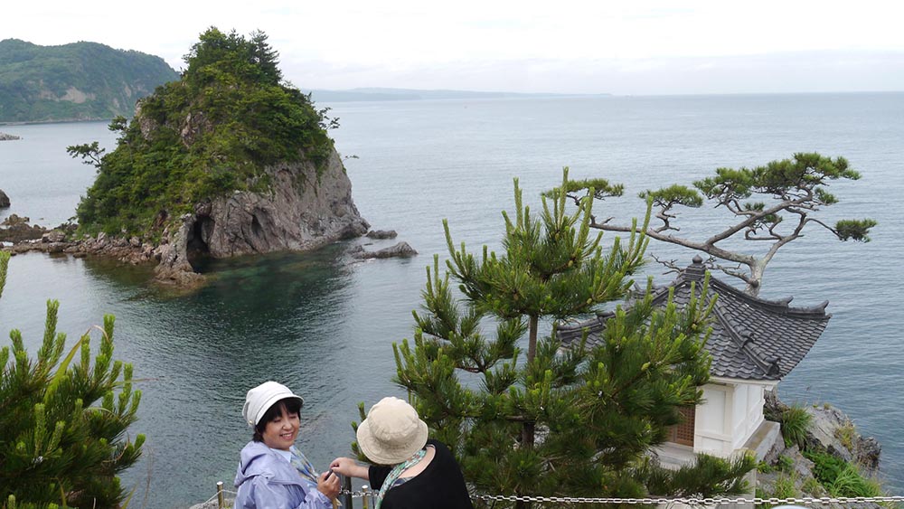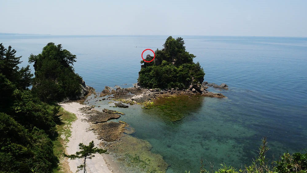 展望所のある場所から、ミサゴの営巣地である斗尺岩を望む
