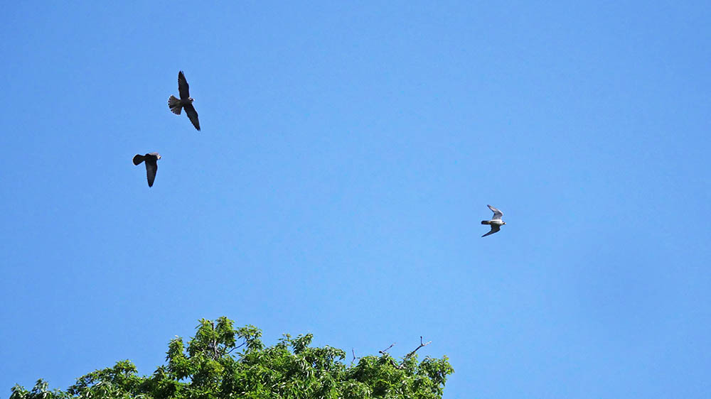 ハヤブサの親子、23日は巣にエサを持ち帰りましたが、24日は親子で飛翔