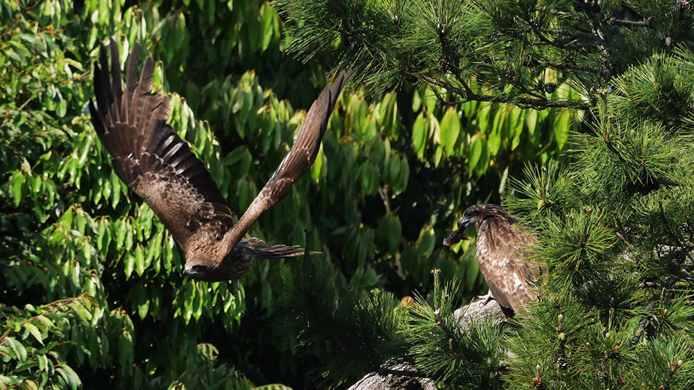 トビが何かを咥えて松へ・・巣立ち後の仔が居てカサゴを貰った
