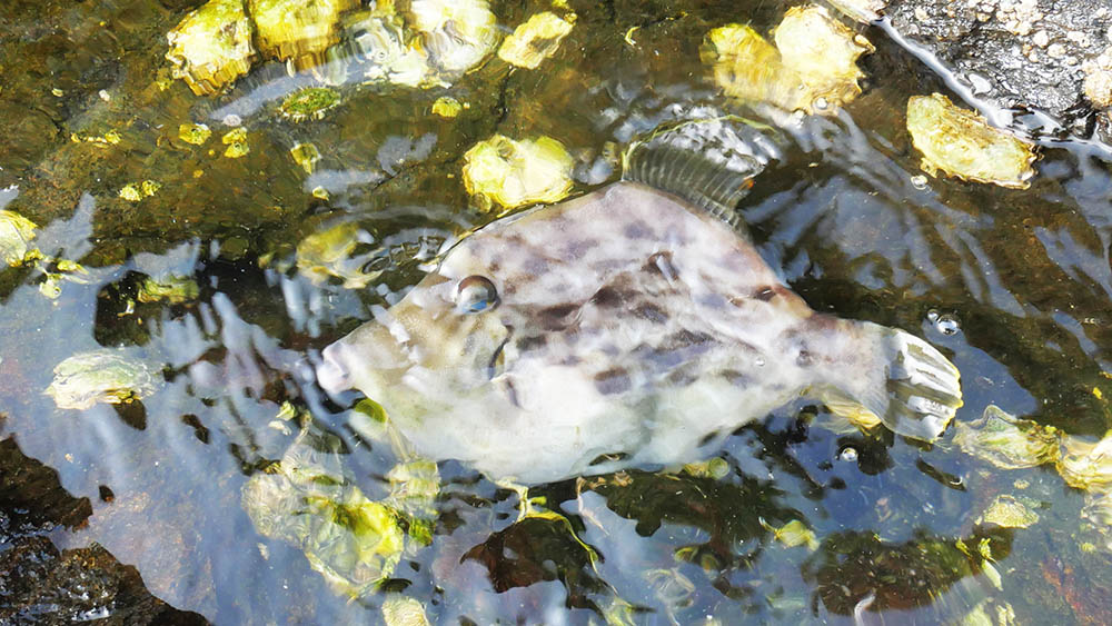 磯際にはハコフグ・ブダイ・カンダイ・アイゴなどが見えており、その中に30㎝は優に超えている大きなカワハギも混じっているので大カワハギを狙います。