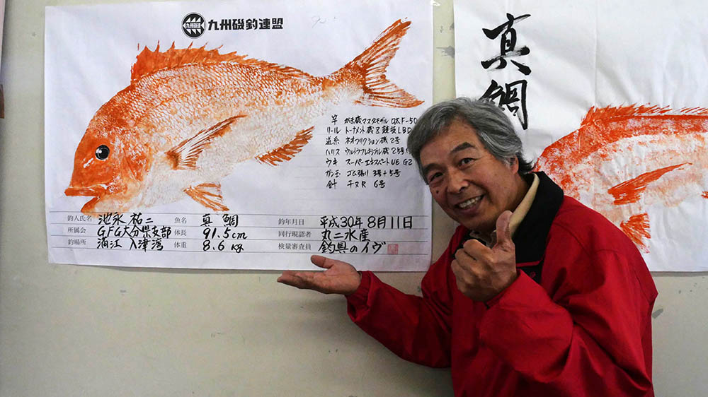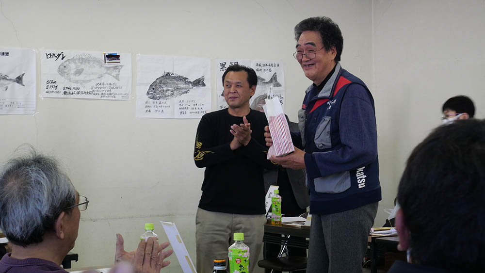 議事終了後、年間大物賞の表彰式で、大分県支部からはマダイの部で私が提出した魚拓が、92.5㎝の審査結果となり、年間大物賞の栄誉を頂いて久しぶりに感謝感激。