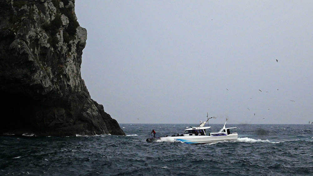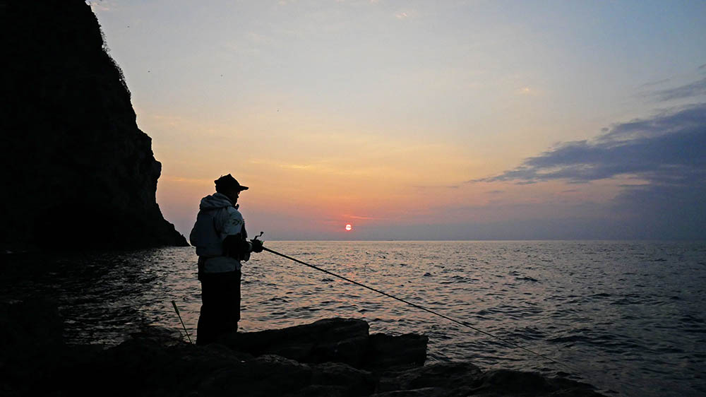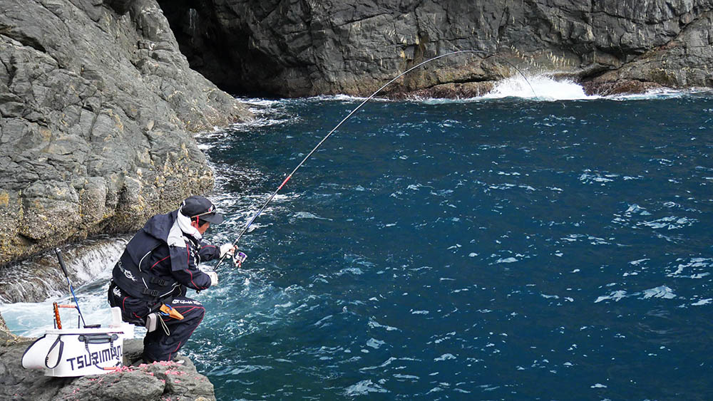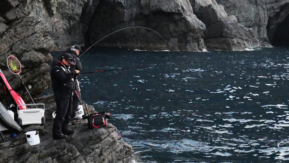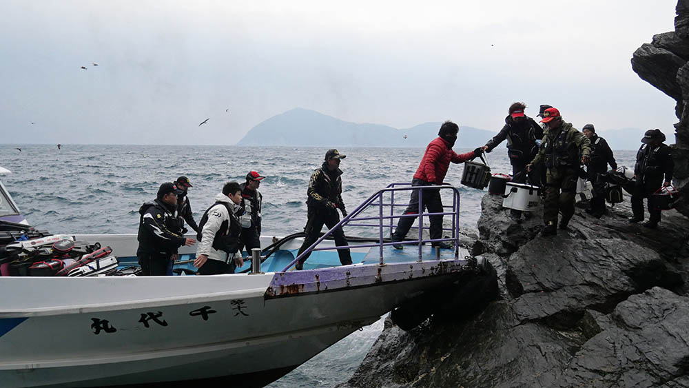 千代丸は沖の黒島方面、ダンゴ・ナガミゾ奥・ビロー下・ウド鼻・東のサラシ・西の鼻横・階段などに2名ずつ、私達6名はナガミゾへ上礁という沖の黒島A級磯占領です。