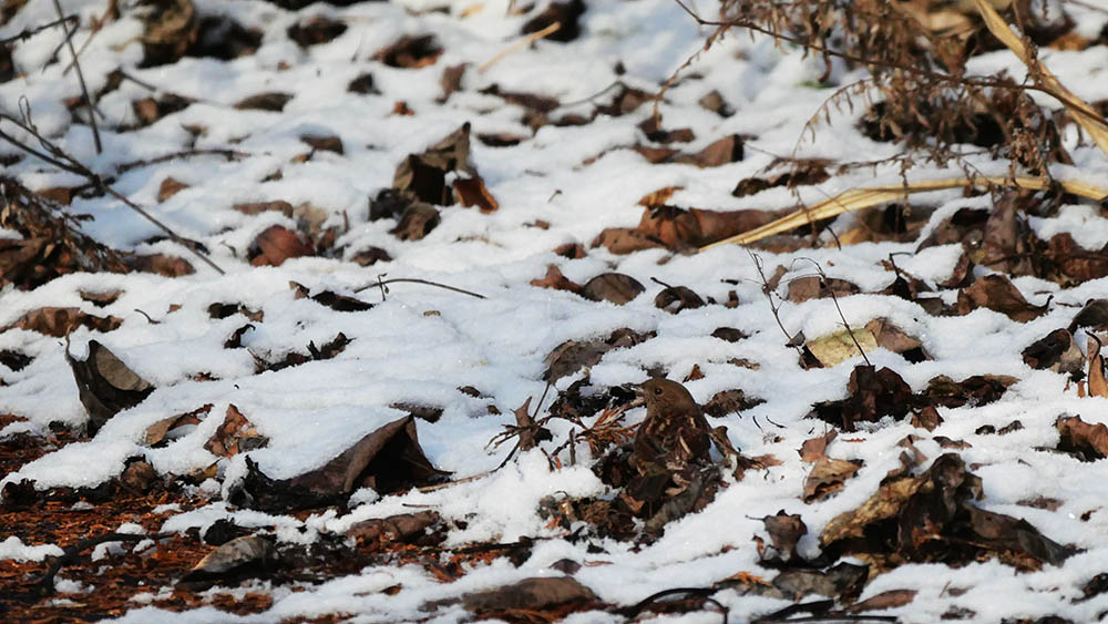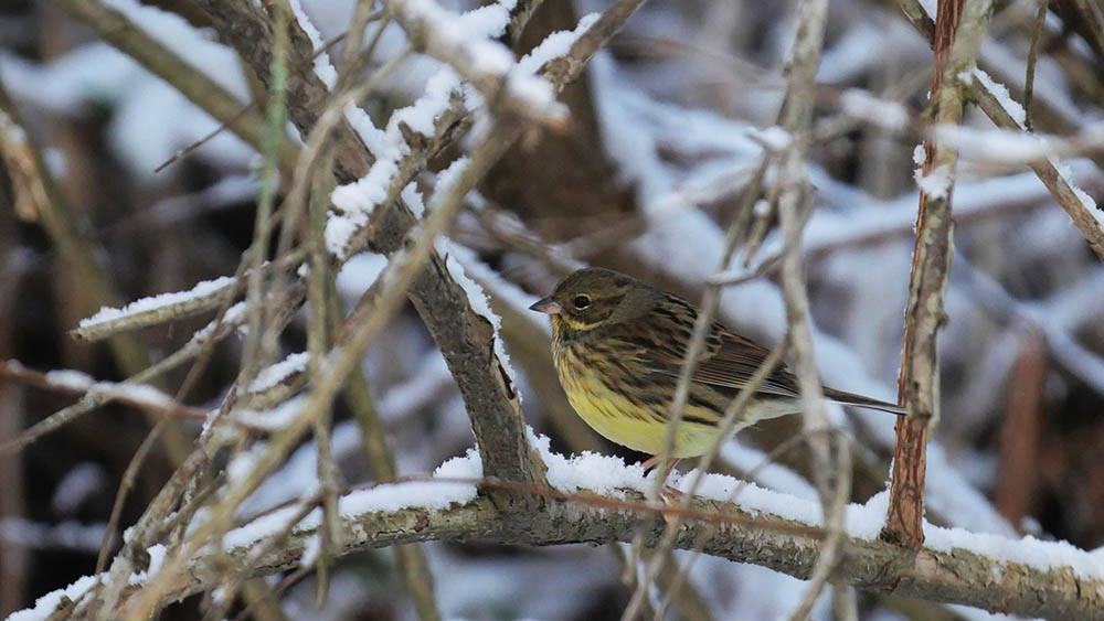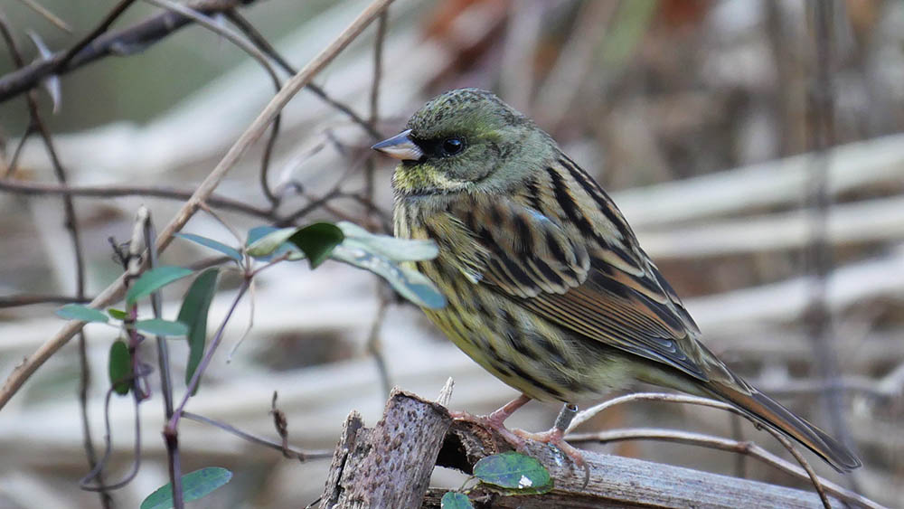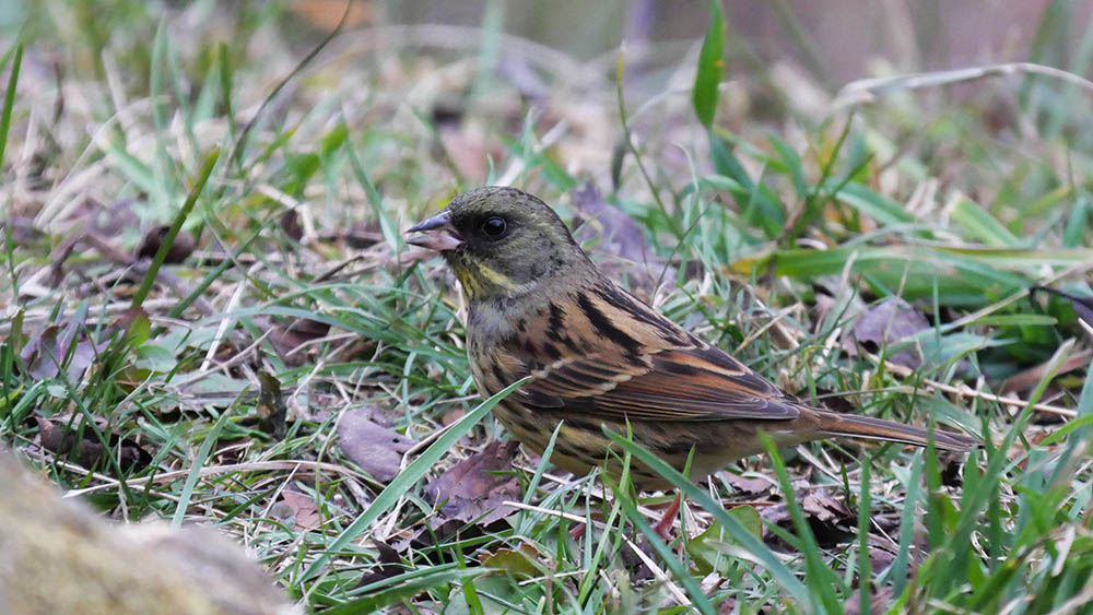 足環アオジは昨年の2月に確認し、今年も同じ個体が来てくれました。2014年9月28日に北海道枝幸郡浜頓別町で、足環を着けて放鳥した当時の若鳥で今年で5年目。