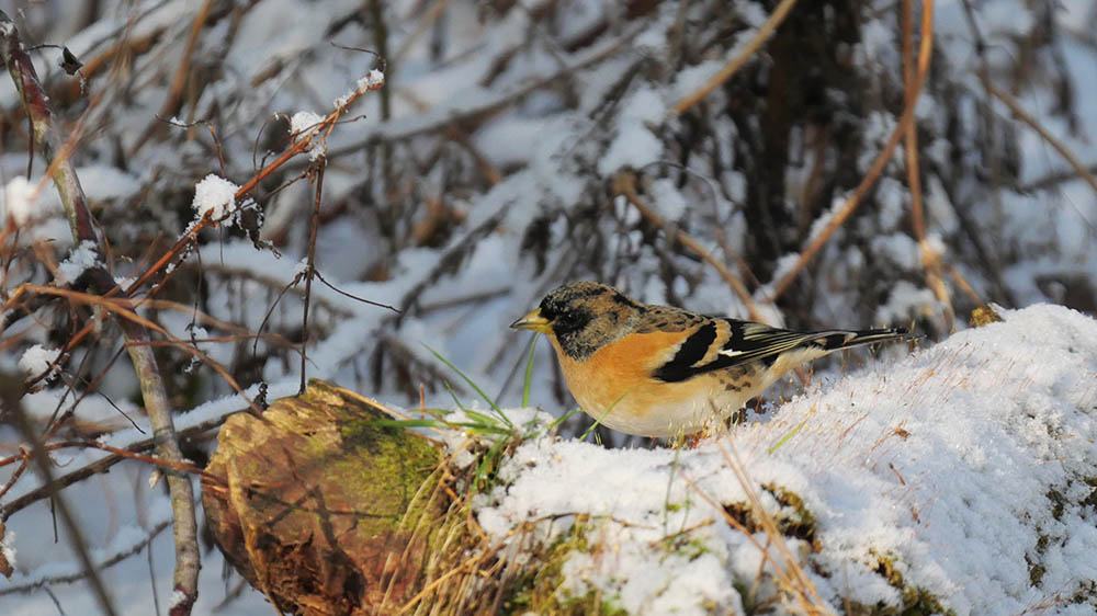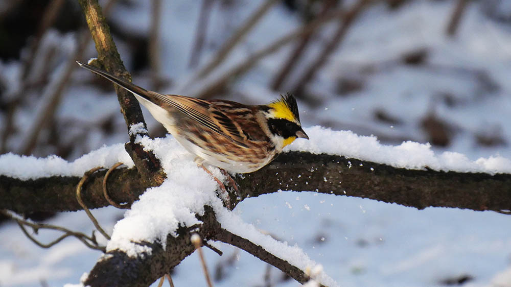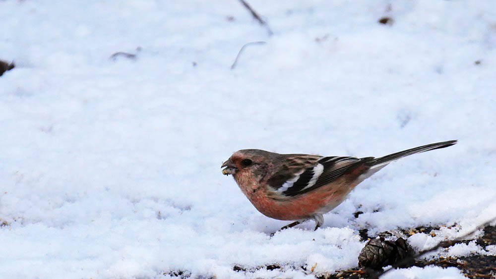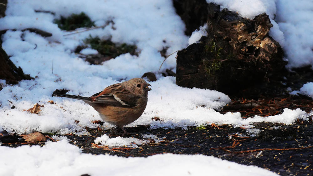 雪とコラボのカヤクグリやベニマシコが撮れる事を願い現地着。降っていた雪は止み、青空とお日様が積もっていた雪を溶かし始めましたが、お昼前には撮れました。