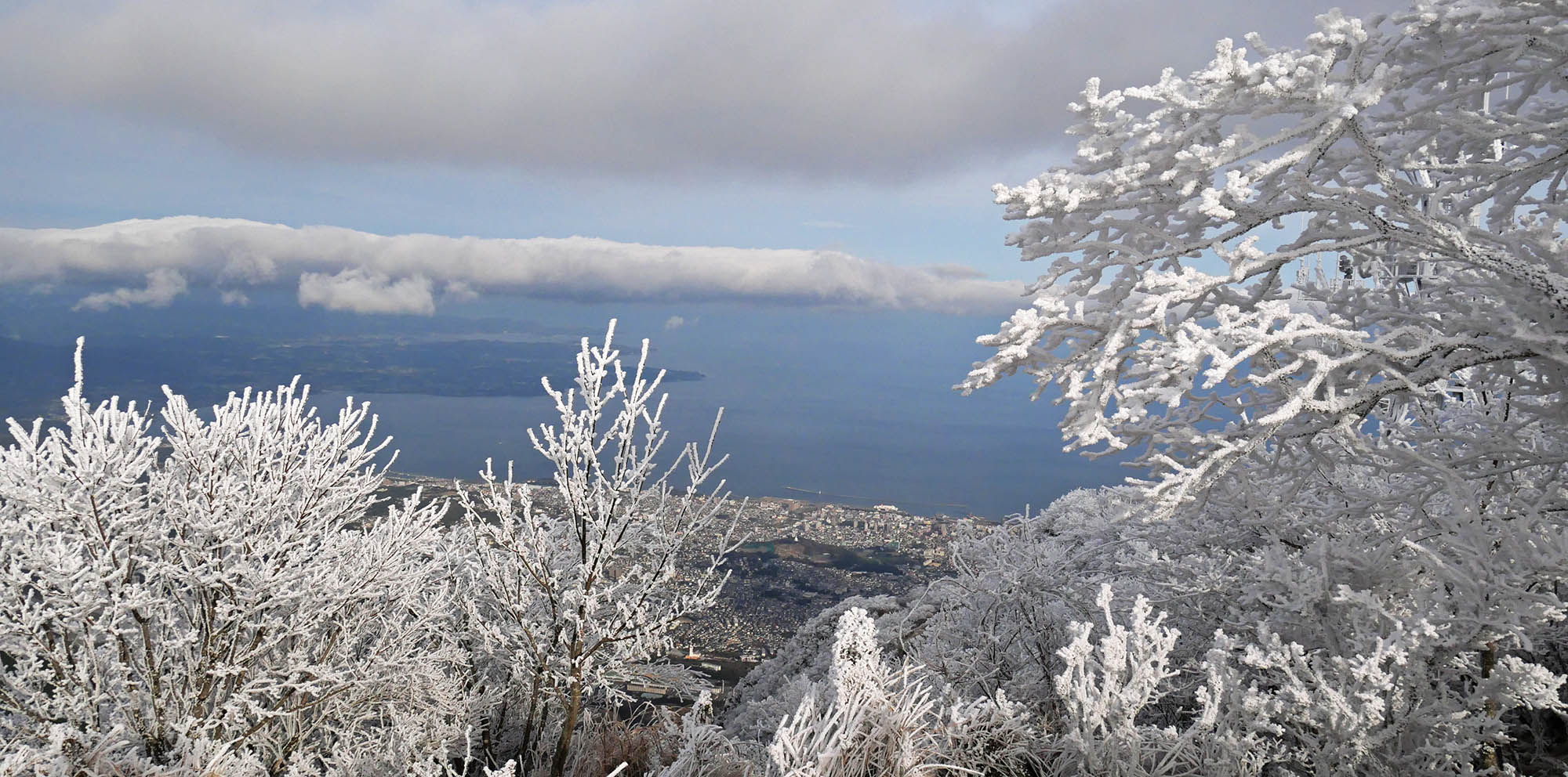その帰り道、由布岳に冠雪、隣の鶴見岳山頂も白くなっているのを確認。