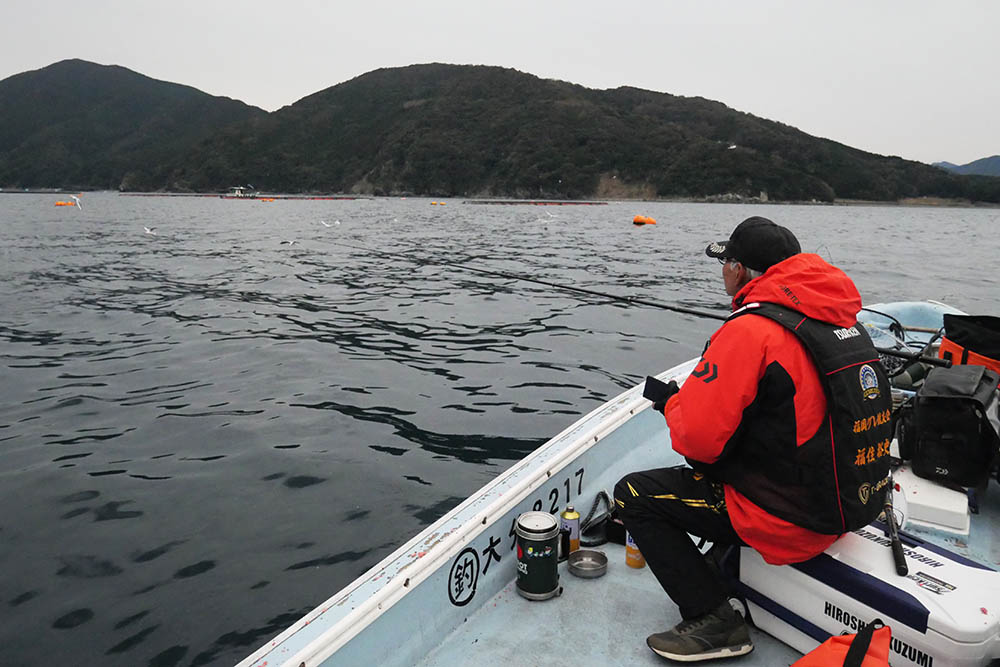 最初は湾内の対岸、次に湾奥、そして沖のイケスと3ヶ所を廻りました。